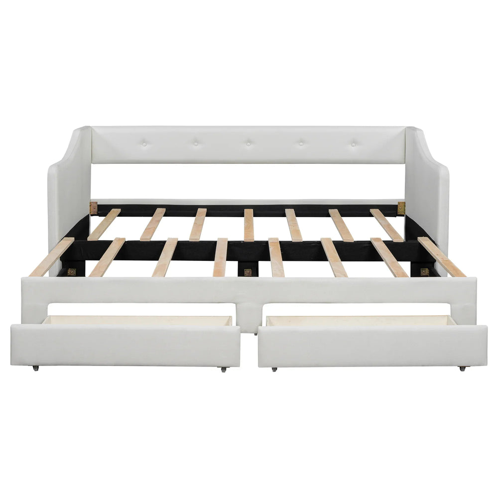 Upgrade your living space with this stylish upholstered daybed that seamlessly transforms from a Twin XL to a King-size bed. Crafted with durable plywood, MDF, and soft linen fabric, it combines durability with elegant comfort. The foam-padded armrests and backrest provide excellent ergonomic support for both seating and sleeping. Integrated under-bed drawers with smooth-rolling wheels offer convenient storage to keep your room organized and clutter-free. Its sturdy wood slat foundation supports mattresses up to 10 inches thick without needing a box spring. Perfect for bedrooms, guest rooms, or home offices, this daybed adapts to your seating and sleeping needs effortlessly. Assembly is simple with pre-drilled holes and a clear manual. Elevate your space with versatile comfort and smart design today.
