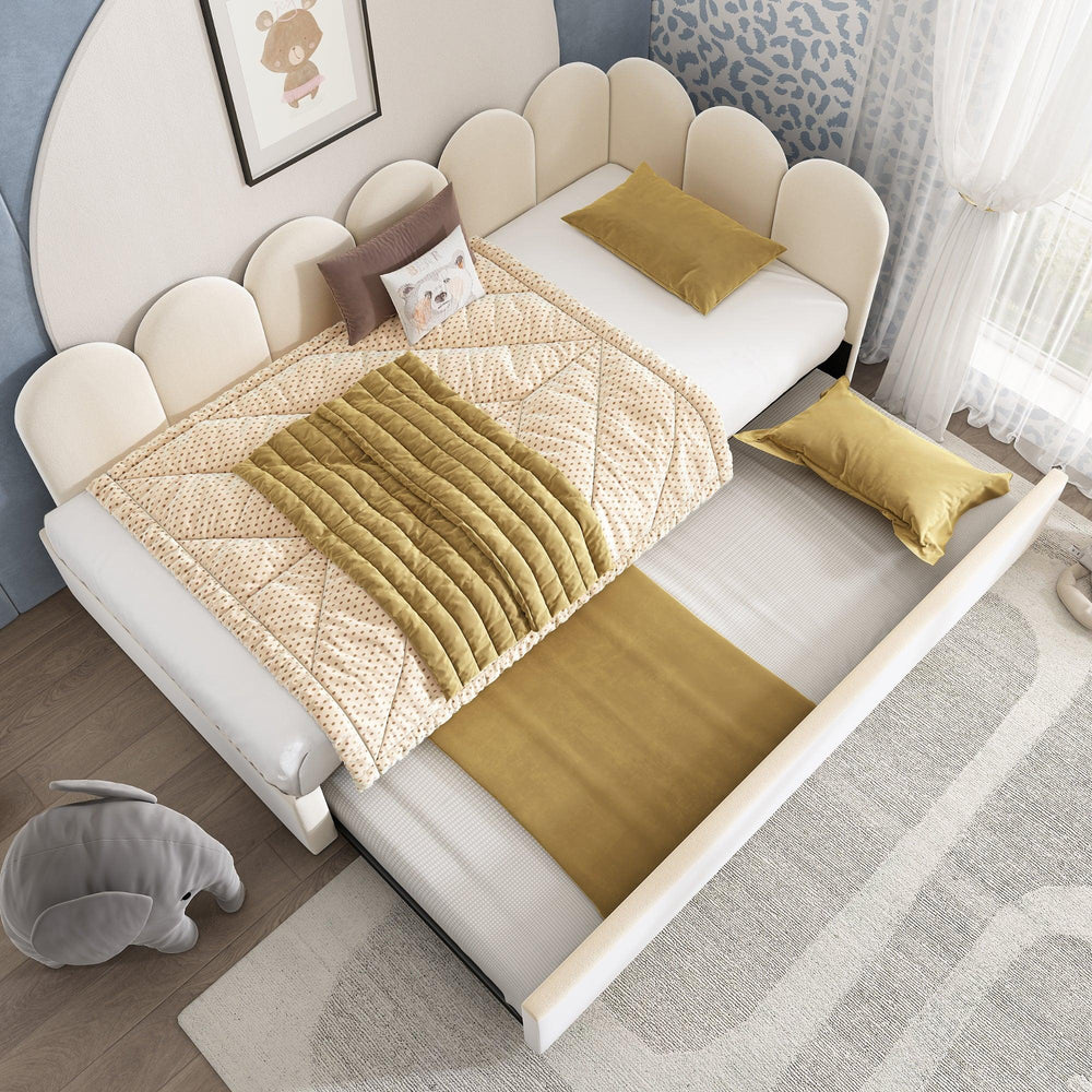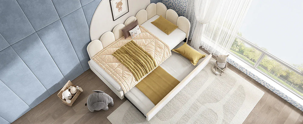 Beige Velvet L-Shaped Twin Daybed With Pull-Out Trundle