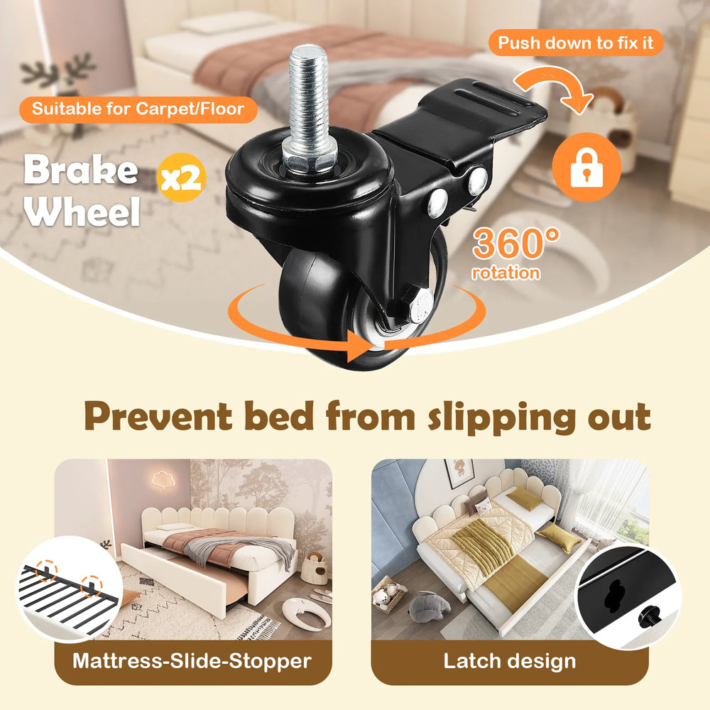 Perfectly designed for both adults and children, this twin-size velvet upholstered daybed with a beige metal frame transforms any room into a cozy retreat. Its clever L-shaped design includes an easy-to-use pull-out twin bed, adding versatile sleeping space without compromising on style. The soft velvet fabric and thick foam backrest provide plush comfort, while the sturdy metal frame ensures durability and support for up to 300 lbs. Ideal for small spaces, guest rooms, or flats, this space-saving sofa bed offers practical functionality with its secure hardware clasps and caster-equipped pull-out bed for smooth mobility. Assembly is simple, and the included clear instructions make setup hassle-free. Elevate your living or sleeping area with this stylish and multifunctional twin sofa bed today.