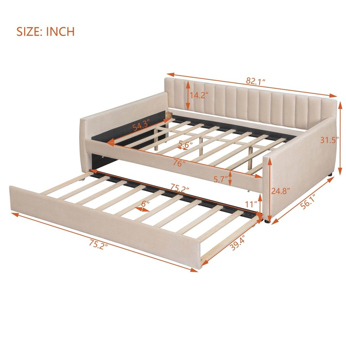 Perfect for homes needing flexible sleeping solutions, this full-size daybed features a convenient pull-out trundle to effortlessly accommodate overnight guests. Upholstered in soft, durable velvet fabric available in elegant beige or gray, it blends style with comfort. The sturdy plywood frame and solid pine legs ensure long-lasting stability, while the wooden slat support eliminates the need for a box spring, promoting mattress breathability and enhanced comfort. The trundle rolls smoothly on built-in casters, making it easy to pull out and store away, ideal for bedrooms, living rooms, or guest spaces. With its classic vertical stripe backrest and cozy armrests, this daybed adds a touch of sophistication to any decor. Elevate your living space with this versatile, space-saving daybed today.