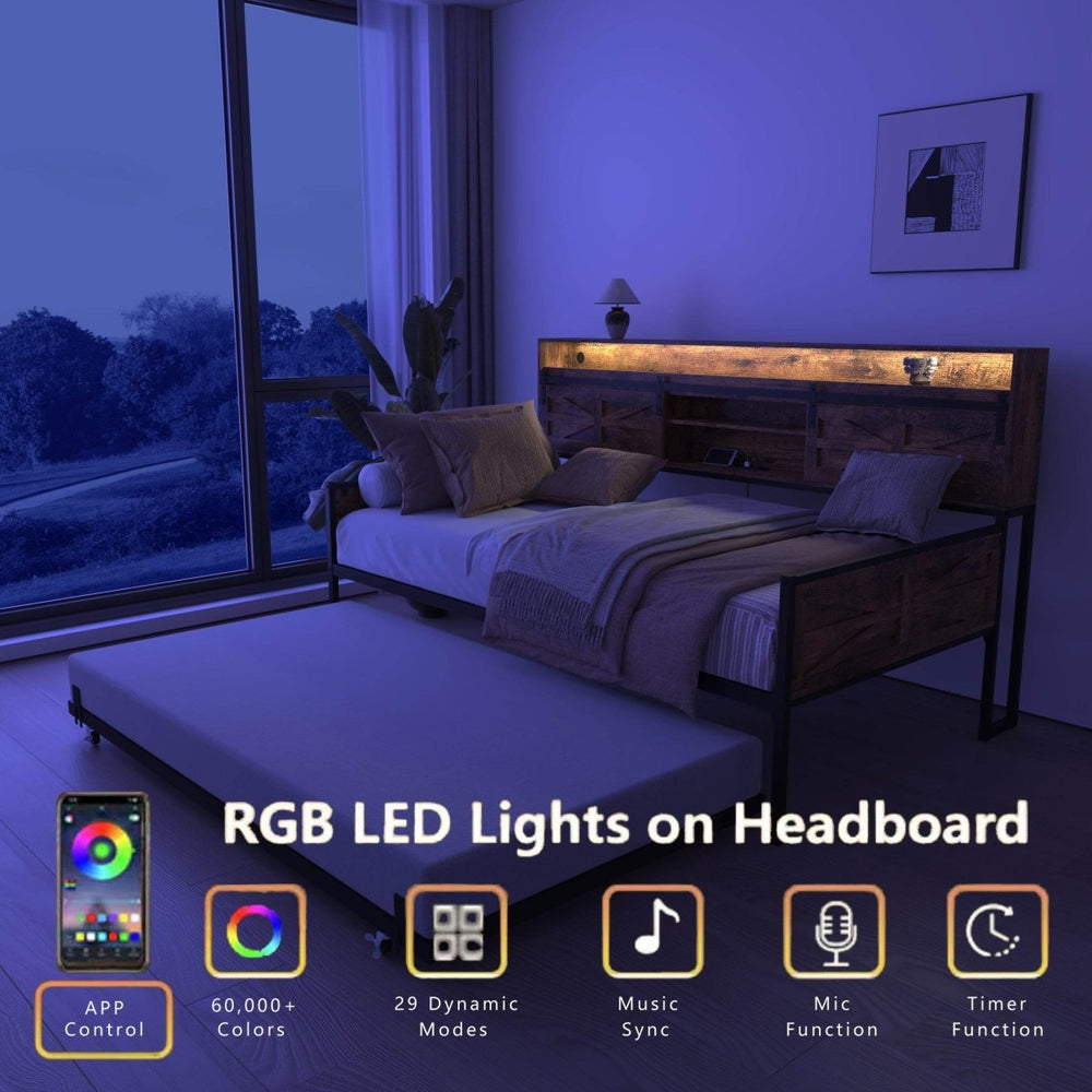 This versatile twin daybed combines rustic charm with practical design, making it ideal for bedrooms, guest rooms, or apartments. Crafted from durable MDF and metal, its farmhouse-inspired frame offers a sturdy and stable foundation that supports up to 400 lbs. The sliding barn door headboard conceals a spacious storage shelf, perfect for organizing personal items out of sight. Easily transform the daybed into two twin beds or a sofa bed to accommodate guests or create flexible living space. Integrated into the design is a convenient charging station with multiple ports, ensuring your devices stay powered, while the customizable LED lights set the perfect mood for any time of day. With smooth lockable wheels, mobility and safety come standard. Elevate your room’s functionality and rustic style today.