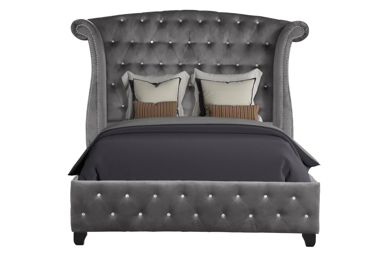 Experience modern elegance and lasting comfort with the SOPHIA Full Bed, crafted from durable acacia wood for a sturdy, reliable frame. Its fully upholstered design wrapped in soft gray velvet enhances both style and coziness, making your bedroom a refined retreat. Crystal tufting on the headboard and footboard adds a sparkling touch of sophistication, while the contemporary silhouette blends seamlessly with various decor styles. Featuring 13 slats for mattress support, this bed eliminates the need for a box spring, simplifying your setup. Designed for full-size mattresses, the SOPHIA Bed combines strength and style to transform your sleeping space. Elevate your relaxation today with this exquisite centerpiece.