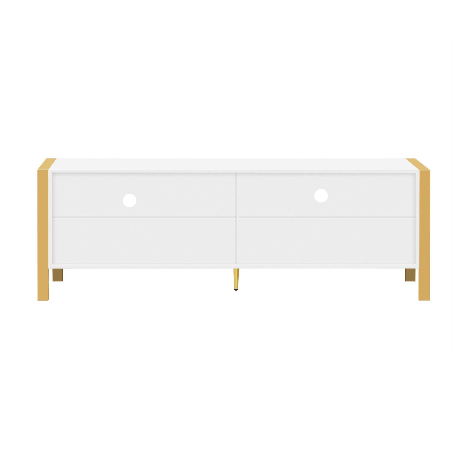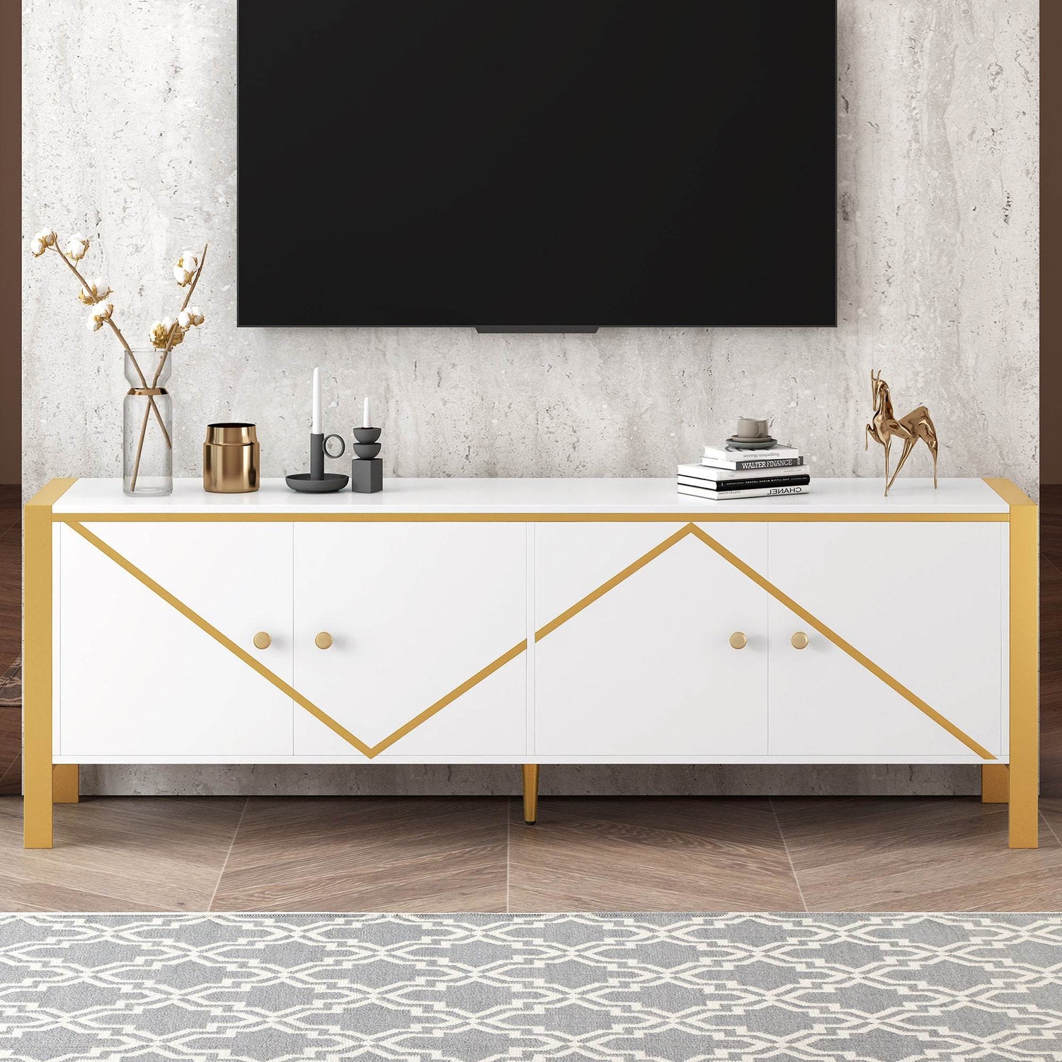 Blend contemporary style with practical design using this sleek 70.9-inch TV stand, crafted to support TVs up to 75 inches. Its clean white MDF surface paired with striking golden metal accents creates a bold, elegant contrast that complements modern interiors. Featuring two spacious cabinets with adjustable shelves, this entertainment center offers customizable storage for your media devices, gaming consoles, books, and decorative items. Thoughtful cable management keeps your setup neat and organized, while durable construction ensures long-lasting stability. Measuring 70.9" W x 15.7" D x 24" H with a sturdy 1.2-inch thick tabletop, it supports up to 220 pounds on top and 65 pounds inside the cabinets. Easy assembly with clear instructions means you can enjoy this minimalist media console in no time. Upgrade your viewing experience and organize your space effortlessly today.