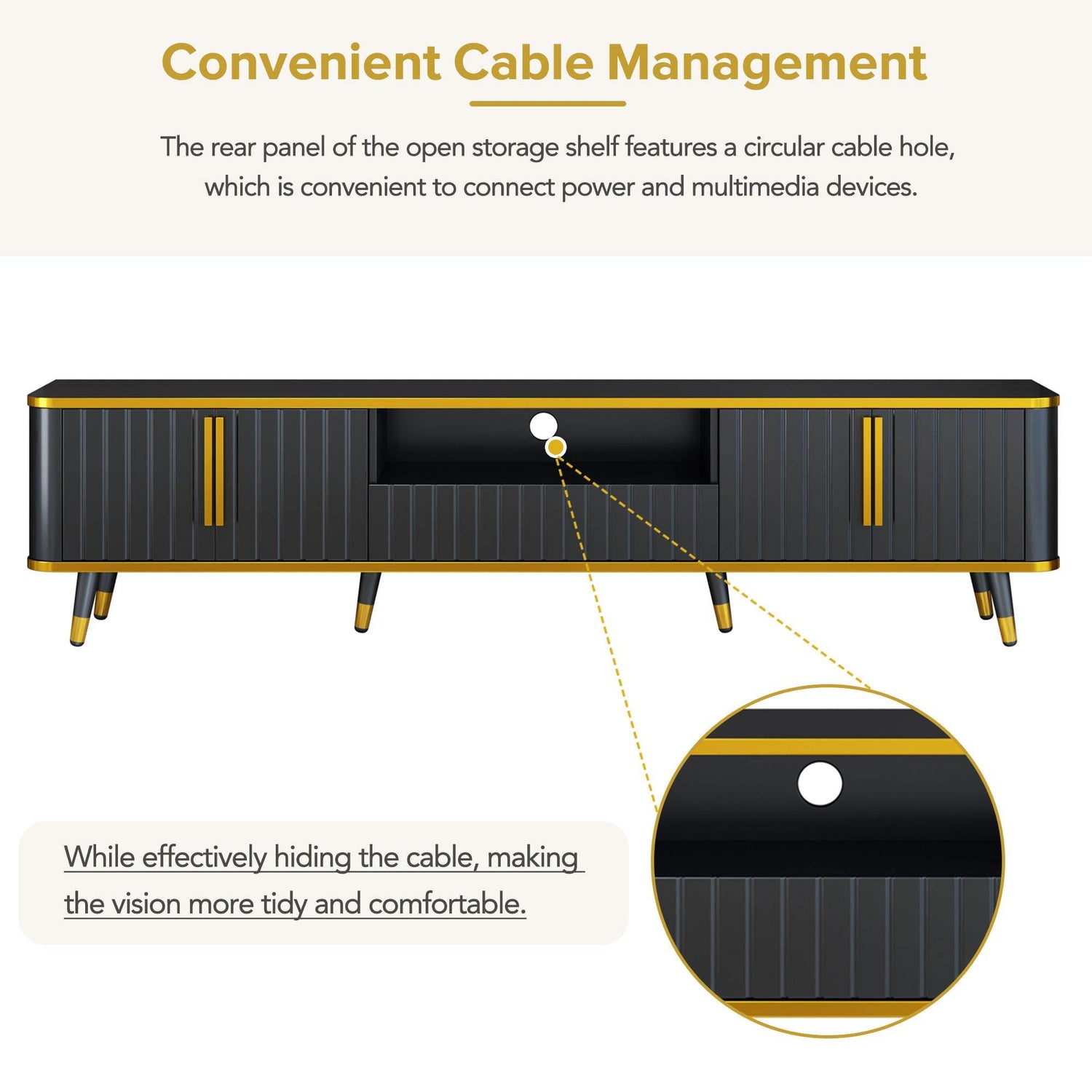 This modern TV Stand features a sleek black and gold design with durable particle board and MDF construction. It offers ample storage with two cabinets, a drawer, and an open shelf with cable management, ideal for organizing media in primary living spaces.