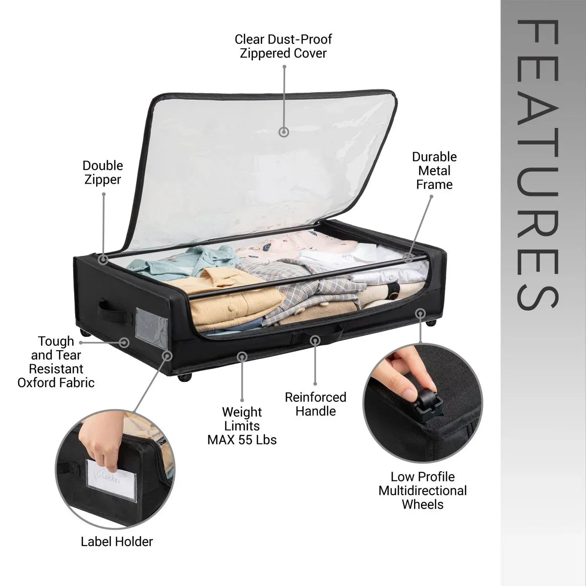 Declutter your bedroom effortlessly with this set of 2 under-bed rolling storage containers, designed to make the most of unused space. Crafted from durable polyester fabric in a sleek black modern style, these containers slide smoothly under most beds thanks to their low 6.7-inch height. Equipped with multi-directional smooth-glide wheels, accessing your stored items is quick and hassle-free. The clear zippered covers provide full visibility while protecting your belongings from dust, dirt, and moisture. Perfect for organizing shoes, clothes, bedding, and seasonal items, these containers bring order and easy accessibility to your home storage. Quick to assemble with no tools required, they offer a versatile and long-lasting storage solution. Elevate your organization and reclaim your space today.