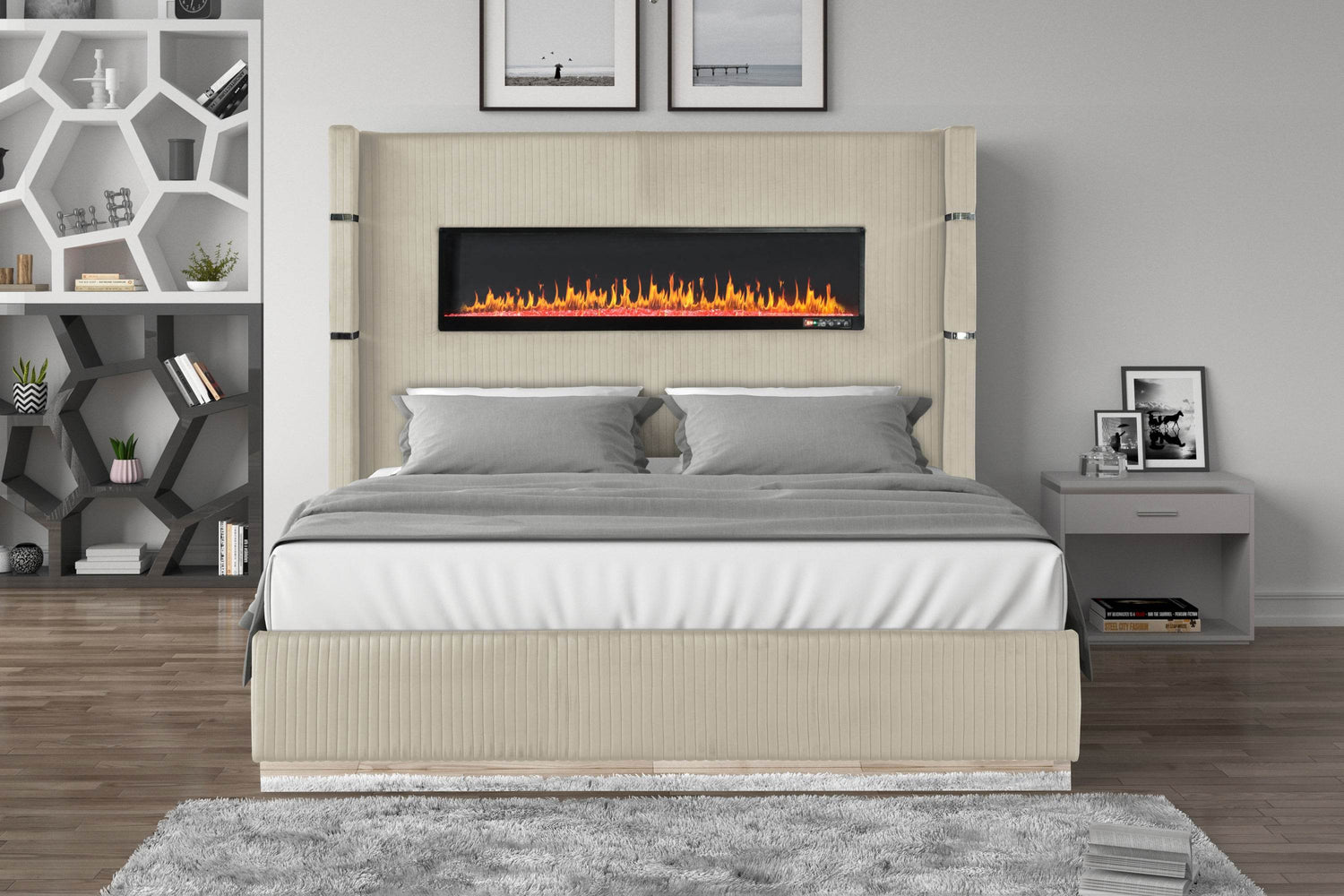 Modern queen-size wood bed with beige velvet upholstery features an ambient electric fireplace display with six colors, built-in USB ports for device charging, and premium Bluetooth speakers for entertainment, enhancing bedroom comfort and convenience with sleek, stylish design.