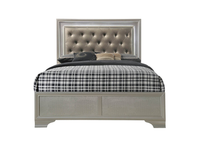 Experience Glamorous Comfort with Our Champagne Crocodile Skin Finish Upholstered LED Panel Bed