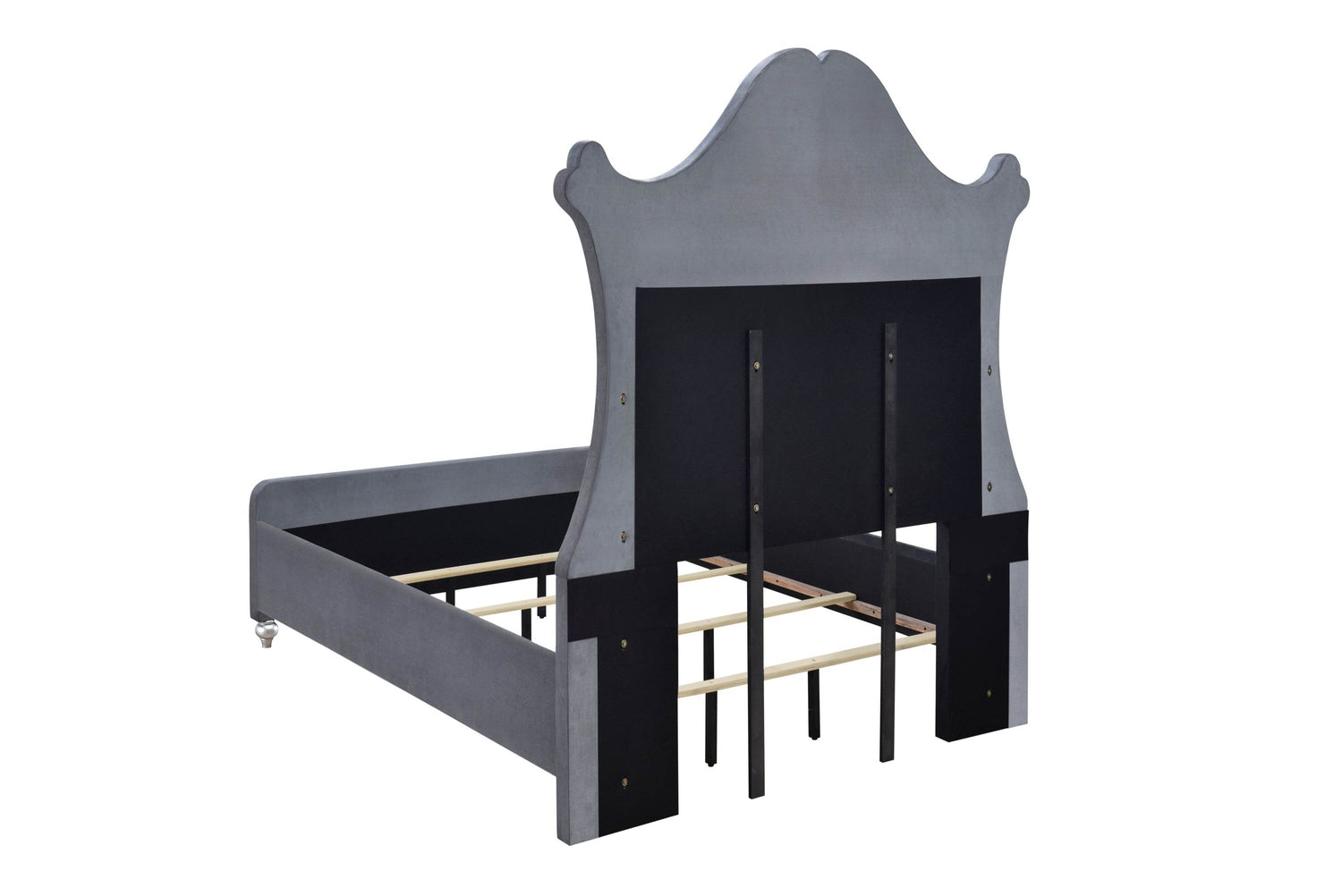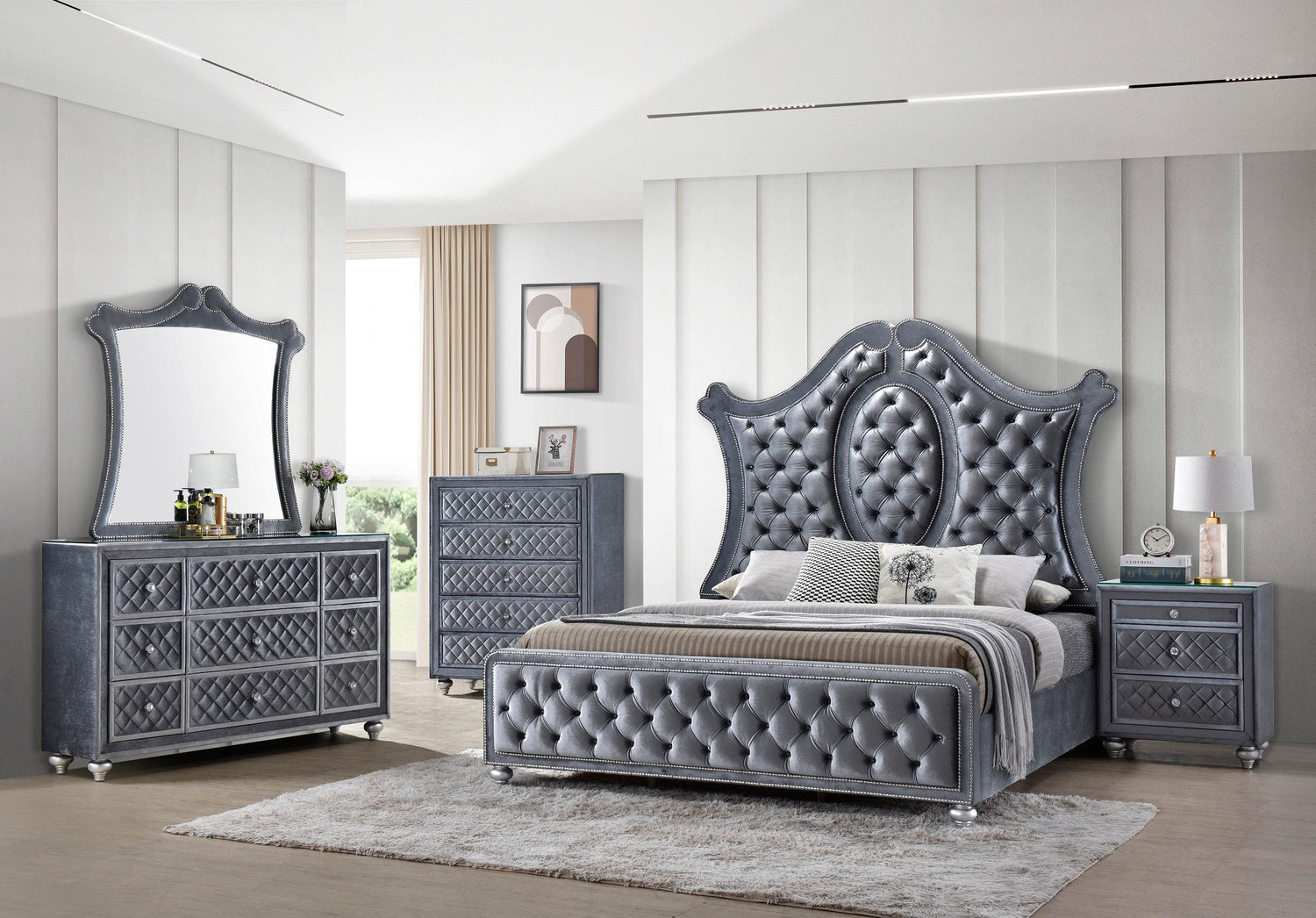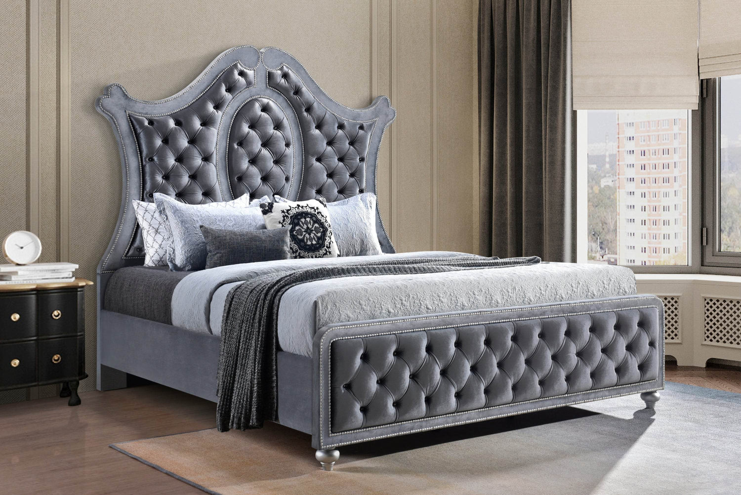 This queen-size panel bed features a tufted headboard with diamond-patterned accents, intricate nailhead trim, and mirrored details. Crafted from wood and fabric in a gray-silver palette, it combines modern glam style with strong, durable construction for elegant bedroom comfort.