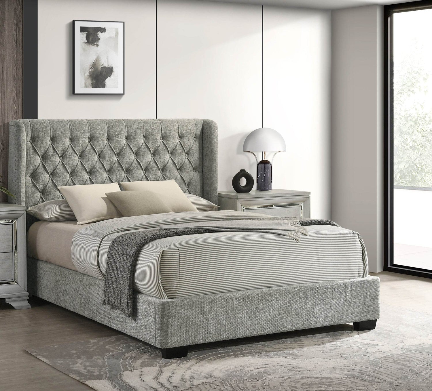 Elevate your bedroom with this stylish king-size bed frame featuring a soft gray tweed fabric and a plush, button-tufted winged headboard. Crafted from durable wood, this contemporary panel bed combines comfort with lasting quality, making it the perfect centerpiece for a modern bedroom. The upholstered headboard offers cozy support for reading or relaxing, while the sleek gray finish complements a wide range of decor styles. Designed to accommodate a box spring, this frame provides sturdy, reliable support for your mattress (not included). Measuring approximately 90 inches long by 85 inches wide and standing 55 inches tall, it offers ample space and presence. Refresh your sleeping space with this sophisticated frame that balances elegance and functionality. Elevate your relaxation today.