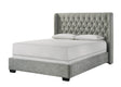 Contemporary king bed frame features a button-tufted, winged headboard and soft tweed fabric for stylish bedroom comfort. Crafted from durable wood with a gray finish, this panel bed requires a box spring and offers modern elegance for restful sleep.