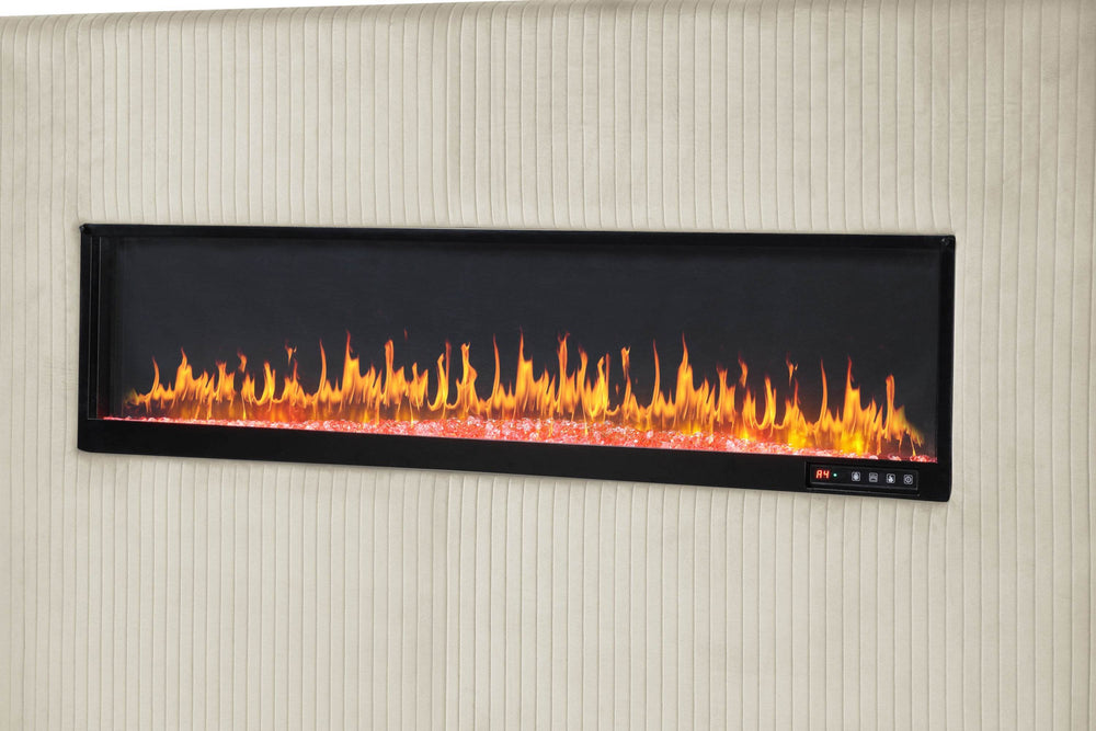 Modern queen-size wood bed with beige velvet upholstery features an ambient electric fireplace display with six colors, built-in USB ports for device charging, and premium Bluetooth speakers for entertainment, enhancing bedroom comfort and convenience with sleek, stylish design.