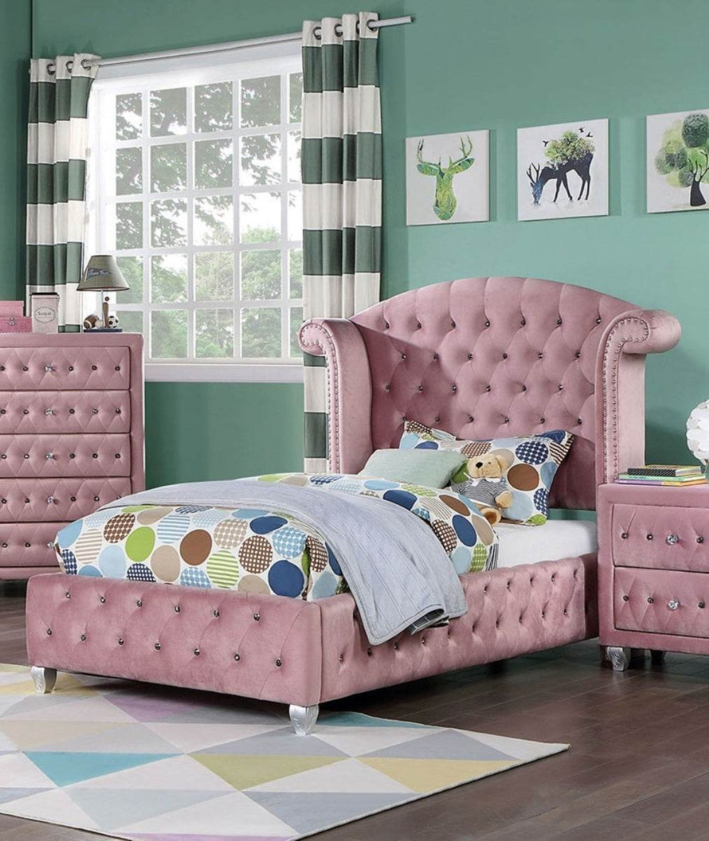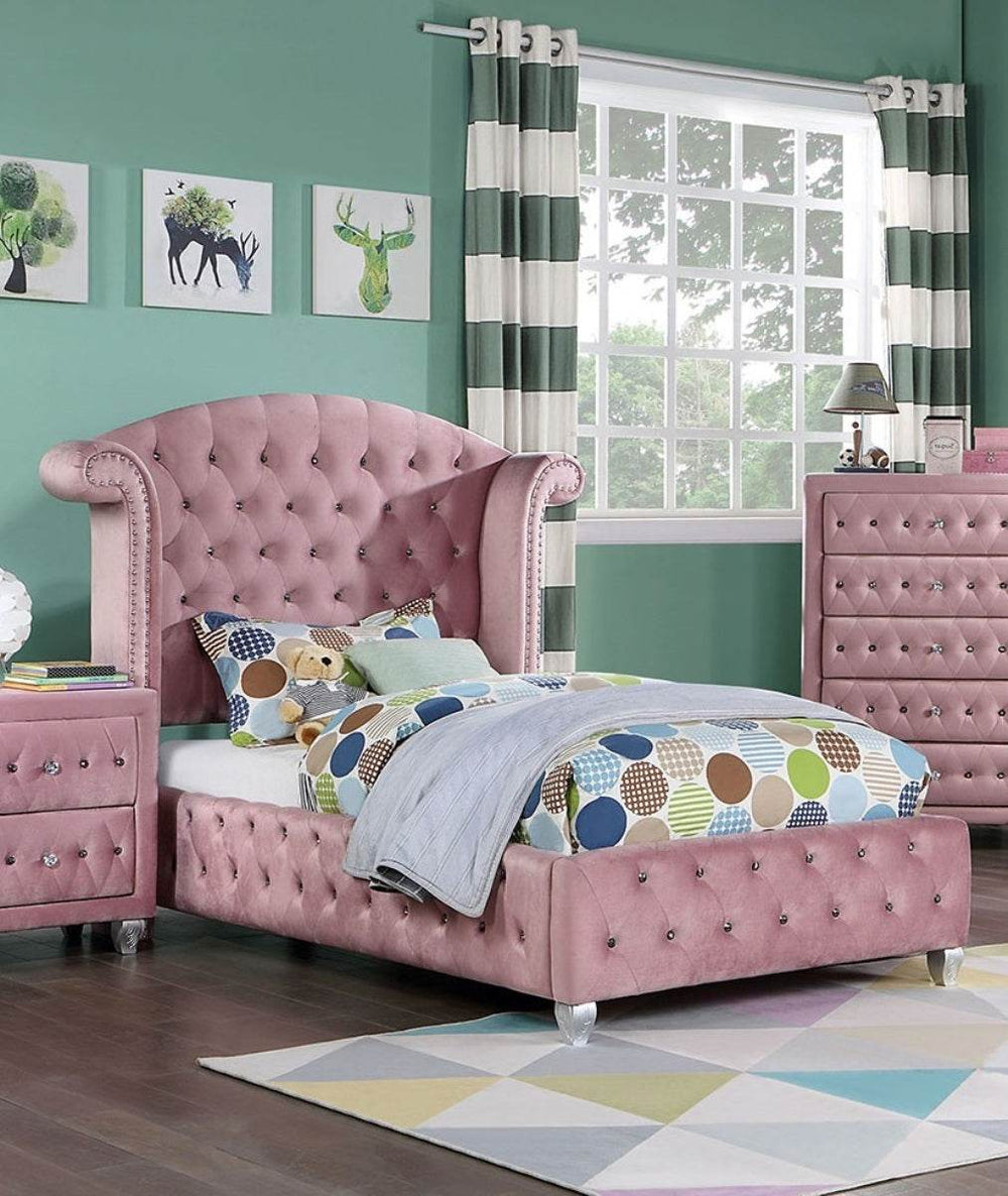 Contemporary pink twin bed featuring a fully upholstered flannelette velvet frame with button tufted wingback headboard, crystal-like acrylic buttons, and elegant cabriole legs. Designed for bedroom use, requires a box spring foundation. Mattress not included.
