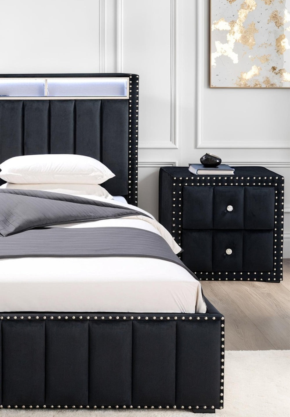 Contemporary black upholstered queen bed frame with built-in LED lighting, nailhead trim, and storage shelves in the headboard. Includes two nightstands with crystal-like knobs and USB-A/USB-C power outlets for modern bedroom convenience. Mattress ready with engineered wood construction.