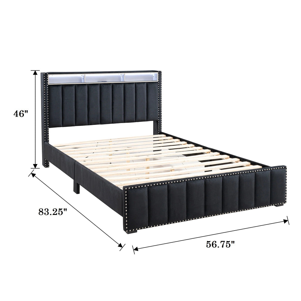 Combine modern style and practical functionality with this stunning 3-piece bedroom set featuring a full size upholstered bedframe and two matching nightstands. The black fabric upholstery showcases elegant vertical channel tufting complemented by sophisticated nailhead trim and crystal-like knobs, adding a refined touch to your bedroom decor. The headboard offers built-in storage shelves and integrated LED touch lighting with three dim levels on both sides, allowing customizable ambiance and convenience. Stay connected effortlessly with the built-in power outlet equipped with USB-A and USB-C ports. Crafted from durable solid, engineered, and rubber wood, this mattress-ready set balances contemporary design and long-lasting quality. Simple assembly makes it easy to upgrade your space—transform your bedroom today with this upscale black bed and nightstand set that blends elegance with everyday practicality.