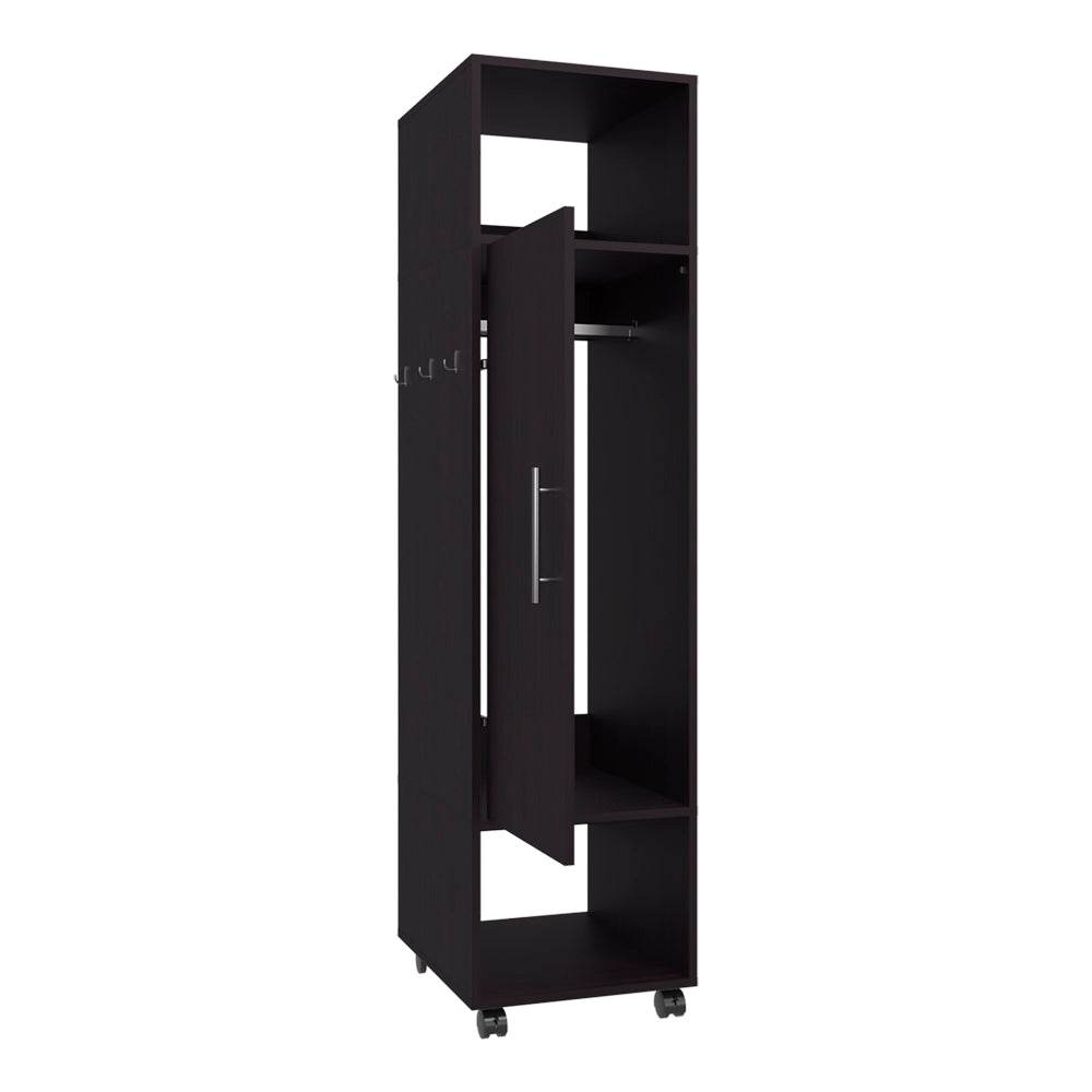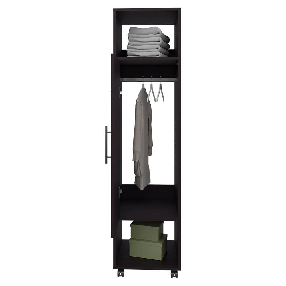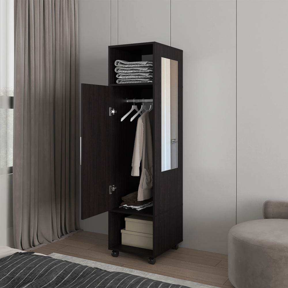 The Wardrobe Boston offers a sleek and practical storage solution designed to enhance any bedroom. Crafted from durable engineered wood with a sophisticated black finish, this wardrobe blends contemporary style with everyday function. Inside, you'll find spacious shelves perfect for folded clothes, shoes, and essentials, alongside a dedicated cabinet with a clothing rod to keep your garments wrinkle-free. An integrated mirror adds convenience, making morning routines effortless. Its compact dimensions—approximately 63 inches tall, 19 inches deep, and 16 inches wide—make it ideal for apartments or rooms where space is limited without sacrificing storage capacity. Engineered for lasting durability and easy maintenance, this wardrobe is a smart and stylish upgrade to organize your bedroom clutter. Elevate your space and simplify your storage today.