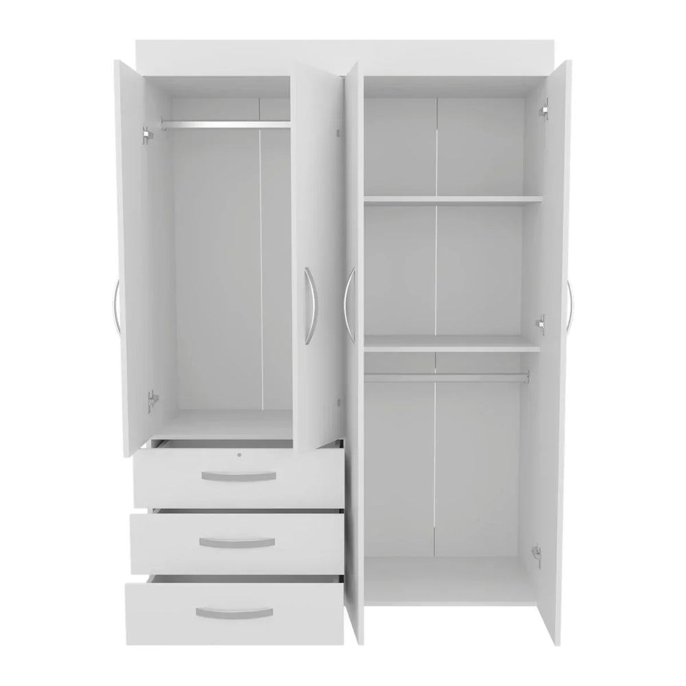 Omega Lifestyles 4-door wardrobe features ample organized storage with three large drawers, two hanging rods, and multiple shelves. Made from engineered wood with particle board filler, it offers easy care and assembly, ideal for bedroom organization and clutter-free living.