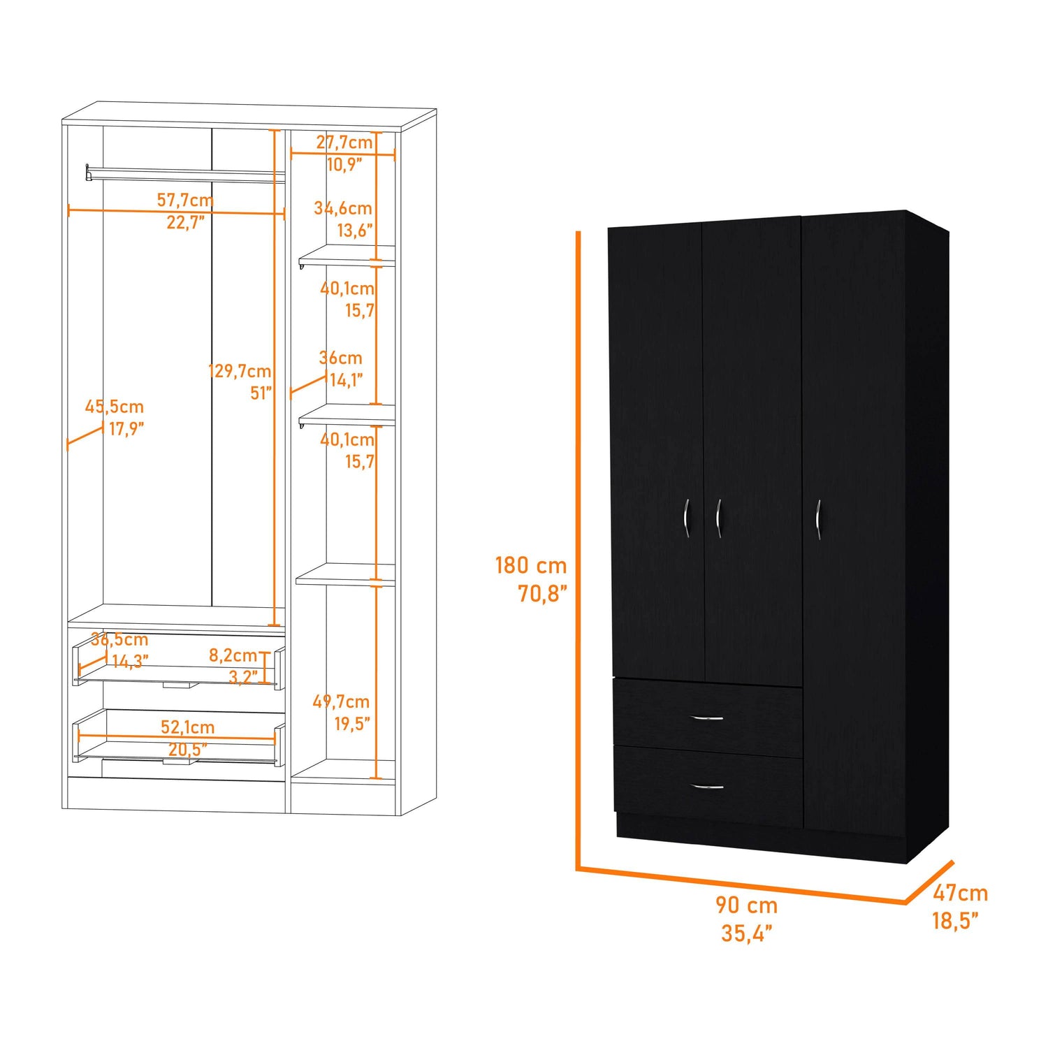 The Eureka Three Door Armoire combines sleek modern design with versatile storage solutions, perfect for any bedroom. Crafted from durable particle board with a melamine finish, this black armoire offers multiple compartments to organize your wardrobe efficiently. Behind the double doors, a spacious cabinet with a clothing rod accommodates hanging garments, while four interior shelves provide ample space for folded clothes, accessories, or linens. Two roomy bottom drawers add extra storage for smaller items or essentials. With its streamlined 70.8 inches tall, 35.4 inches wide, and 18.5 inches deep (180 cm x 90 cm x 47 cm) profile, the armoire fits comfortably in most rooms without overwhelming your space. Upgrade your bedroom organization and bring order to your wardrobe with this stylish, multifunctional piece. Elevate your storage today.
