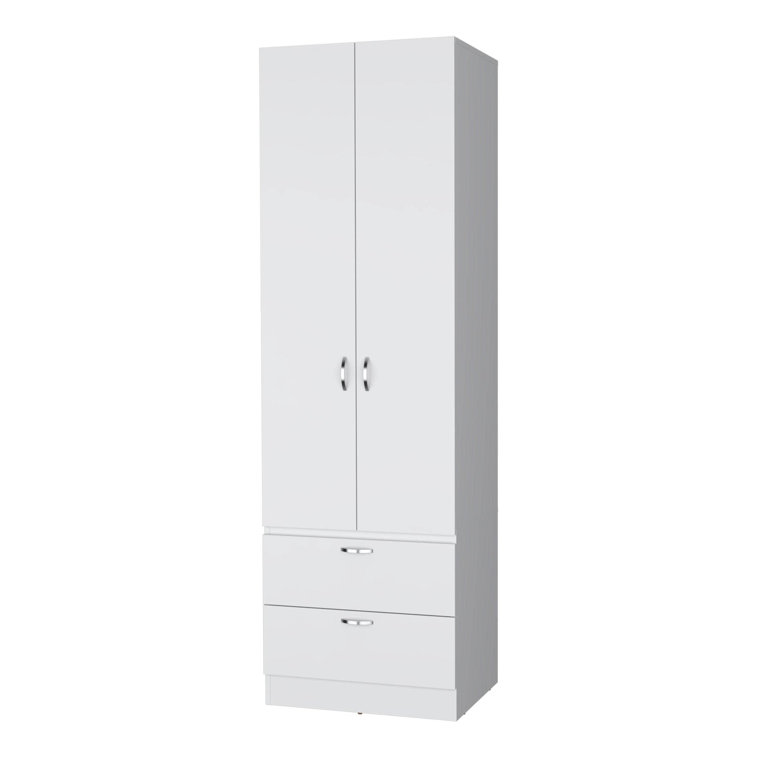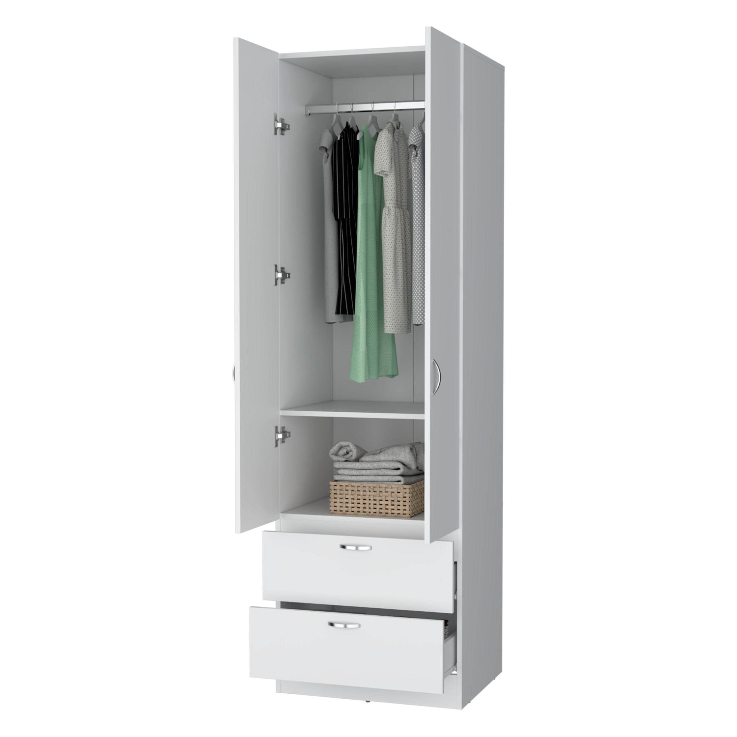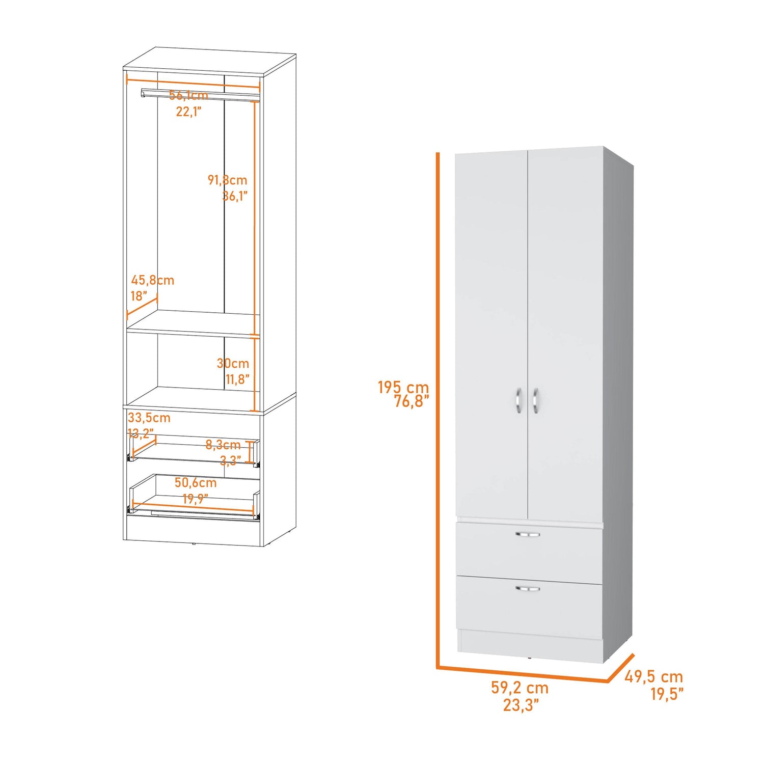 Streamline your closet organization with the Tall Mayer Wardrobe, crafted from durable melamine with a sturdy particle board core. Standing an impressive 76.8 inches tall, this wardrobe offers generous storage through two spacious doors, two smooth-glide drawers, and a hanging rod perfect for keeping both adult and children's clothing wrinkle-free. Its sleek white finish complements any bedroom style, blending practicality with clean, modern design. Ideal for compact spaces, the wardrobe’s 23.3-inch width and 19.5-inch depth provide ample capacity without overwhelming your room. Whether you need extra storage for accessories or to neatly arrange your outfits, this versatile wardrobe keeps your space tidy and clothes easily accessible. Elevate your bedroom organization and refresh your living space today.