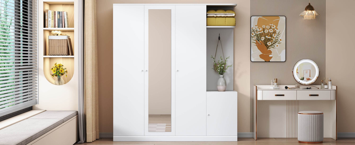 Organize your bedroom effortlessly with this sleek 4-door wardrobe, crafted from durable particle board for lasting strength. Its clean white finish complements modern and classic interiors alike. The built-in full-length mirror adds convenience for daily outfit checks, seamlessly combining function and style. Inside, two dust-proof compartments with sturdy hanging rods keep your clothes protected and wrinkle-free. A smooth pull-out drawer offers additional space for folded garments, while a dedicated shoe storage door helps maintain clutter-free floors. Safety features like pin stoppers prevent accidental door openings, and anti-tip devices ensure stability. Measuring 58.9 inches long, 20.5 inches wide, and 65.9 inches high, this wardrobe delivers ample storage without overwhelming your room. Elevate your home organization today with this practical and elegant wardrobe solution.