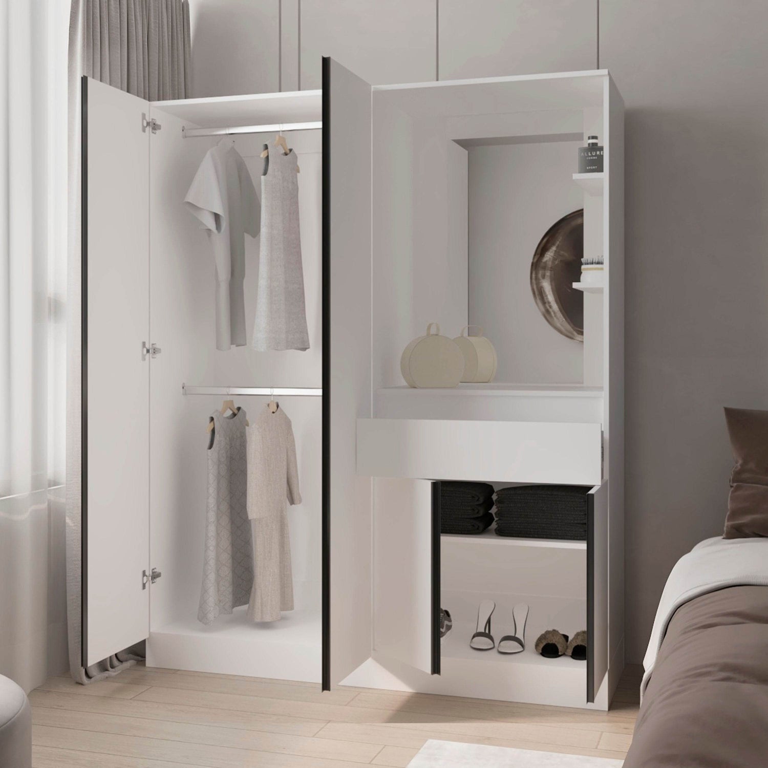 - Integrated Wardrobe and Vanity: Combines clothing and makeup storage in one unit