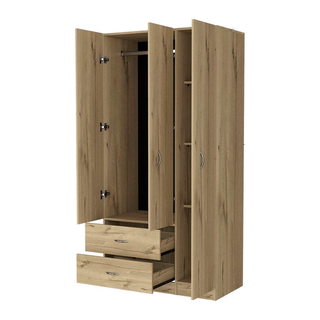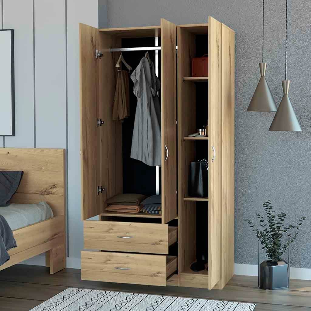 Modern three-door armoire features four interior shelves, a double door cabinet with clothing rod, and two drawers for versatile bedroom storage. Crafted from particle board with melamine filler in light oak finish, it optimizes organization while complementing modern bedroom decor.