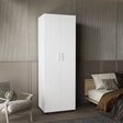 Modern white MDF two-door armoire offers organized bedroom storage with two internal shelves and a metal rack for hanging clothes. Easy to assemble, it complements primary living spaces and coordinates with matching collection pieces sold separately.