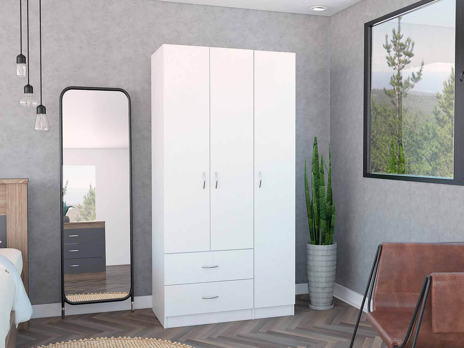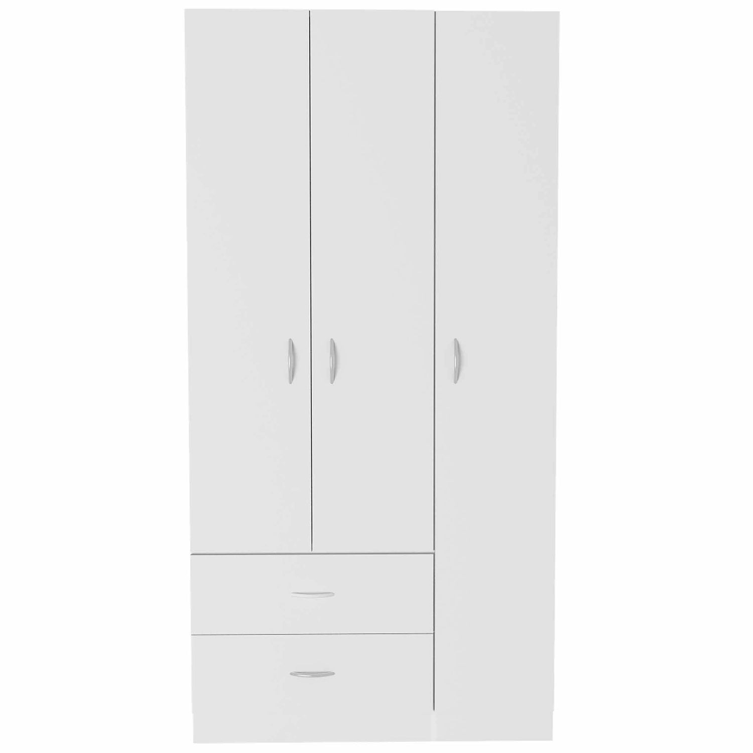 Free-standing white particle board armoire offers ample bedroom storage with three sections, versatile shelving, two drawers, and a hanging rod for wrinkle-free clothing organization. Its modern design maximizes space efficiency while enhancing room functionality.
