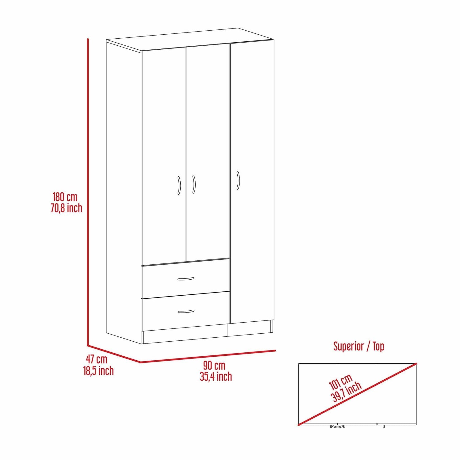 The Austral 3 Door Armoire offers a modern storage solution that blends style and functionality. Crafted from durable white particle board, this freestanding wardrobe features three spacious sections for organizing your clothing and accessories with ease. Five adjustable shelves create versatile space for folded garments, shoes, and bags, while two 20-inch wide drawers keep intimates and socks neatly tucked away. A dedicated hanging rod spans 22 inches wide and 51 inches high, perfect for wrinkle-free storage of dresses, pants, and shirts. Standing 70.8 inches tall, yet only 18.5 inches deep, it fits compactly into any bedroom without overwhelming your space. Elevate your bedroom’s organization and aesthetic with this versatile armoire today.
