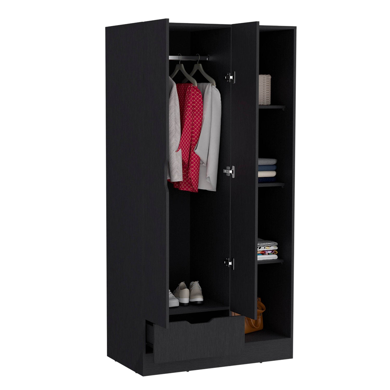 Roomy black particle board wardrobe armoire features double doors, built-in hanging rod for wrinkle-free clothing storage, four spacious shelves, and a large lower drawer for accessories. Its slim profile maximizes space, ideal for organized bedroom storage.
