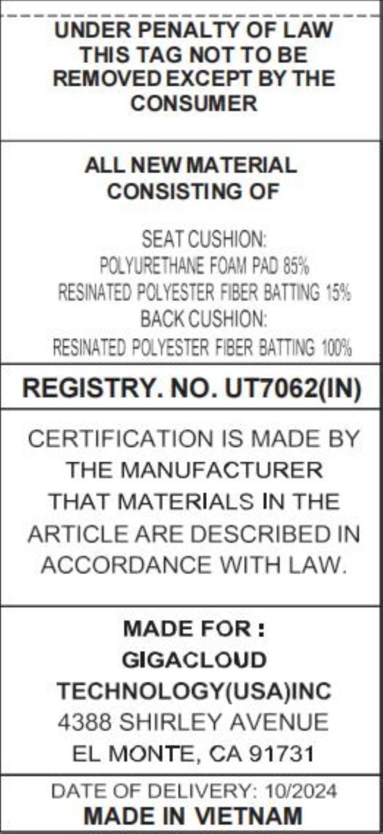 Cushion Filler: Foam, density approx. 1.7 lbs/cu.ft (27.3 kg/m³)