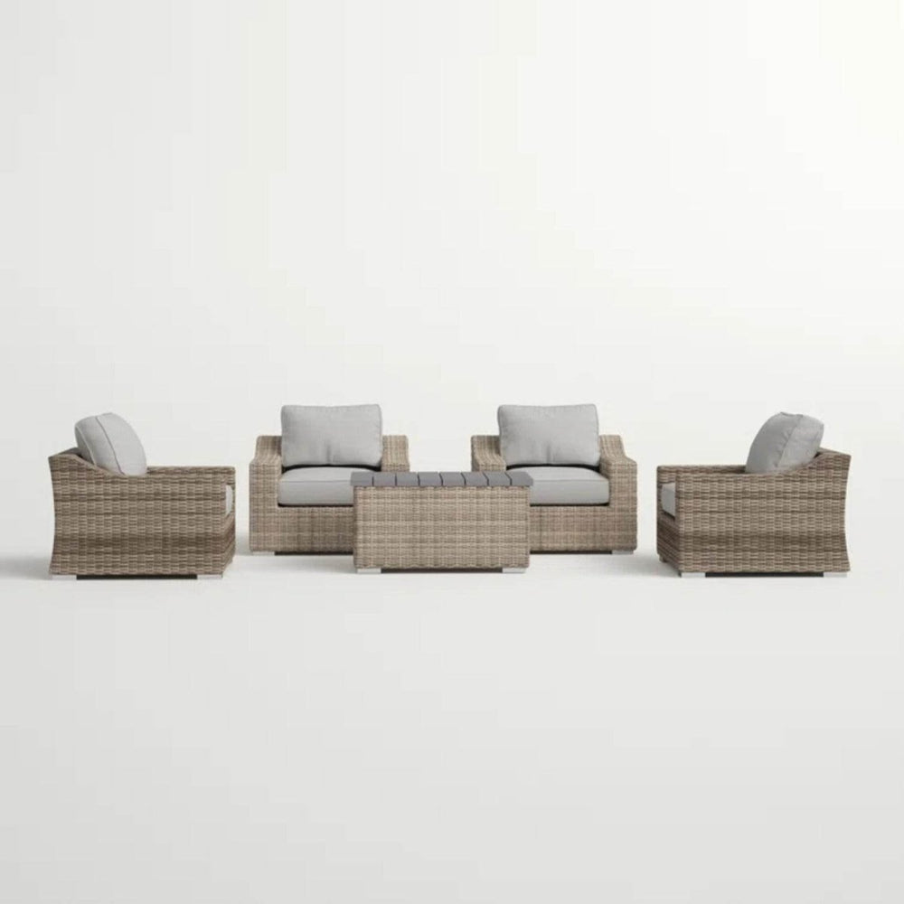 Elevate your patio or garden with this 5-piece all-weather wicker sectional seating group, designed for modern outdoor comfort and style. Featuring four spacious club chairs with plush, foam-filled cushions wrapped in water- and UV-resistant gray olefin fabric, this set ensures lasting comfort and durability. The powder-coated aluminum frames covered in handwoven HDPE wicker provide exceptional resistance to rust, fading, and cracking — perfect for year-round outdoor use. A sleek, slatted rectangular coffee table completes the ensemble, offering a convenient surface for drinks and décor. Fully assembled and ready to enjoy, this seating group blends coastal-inspired aesthetics with practical, low-maintenance materials to transform your outdoor space into a relaxing retreat. Upgrade your alfresco living today.