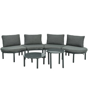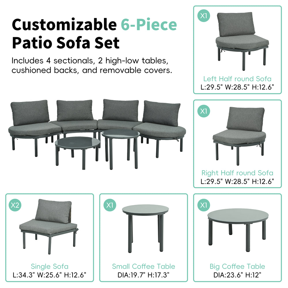 Transform your backyard, patio, or poolside into a stylish retreat with this versatile 6-piece outdoor sectional sofa set. Featuring 4 independent armless sofas and 2 high-low round coffee tables with tempered glass tops, this modular furniture lets you customize your seating arrangement to fit any space perfectly. Crafted from a weather-resistant aluminum frame and durable PE wicker rattan, the set resists outdoor elements while providing lasting comfort. Each piece comes with removable, water-resistant cushions and back pillows, including unique half-round cushions for the half-moon sofas, ensuring plush relaxation. Easy to clean and maintain, this outdoor sectional is ideal for hosting friends or enjoying a quiet moment in nature. Upgrade your outdoor area today with this modern, functional seating group.