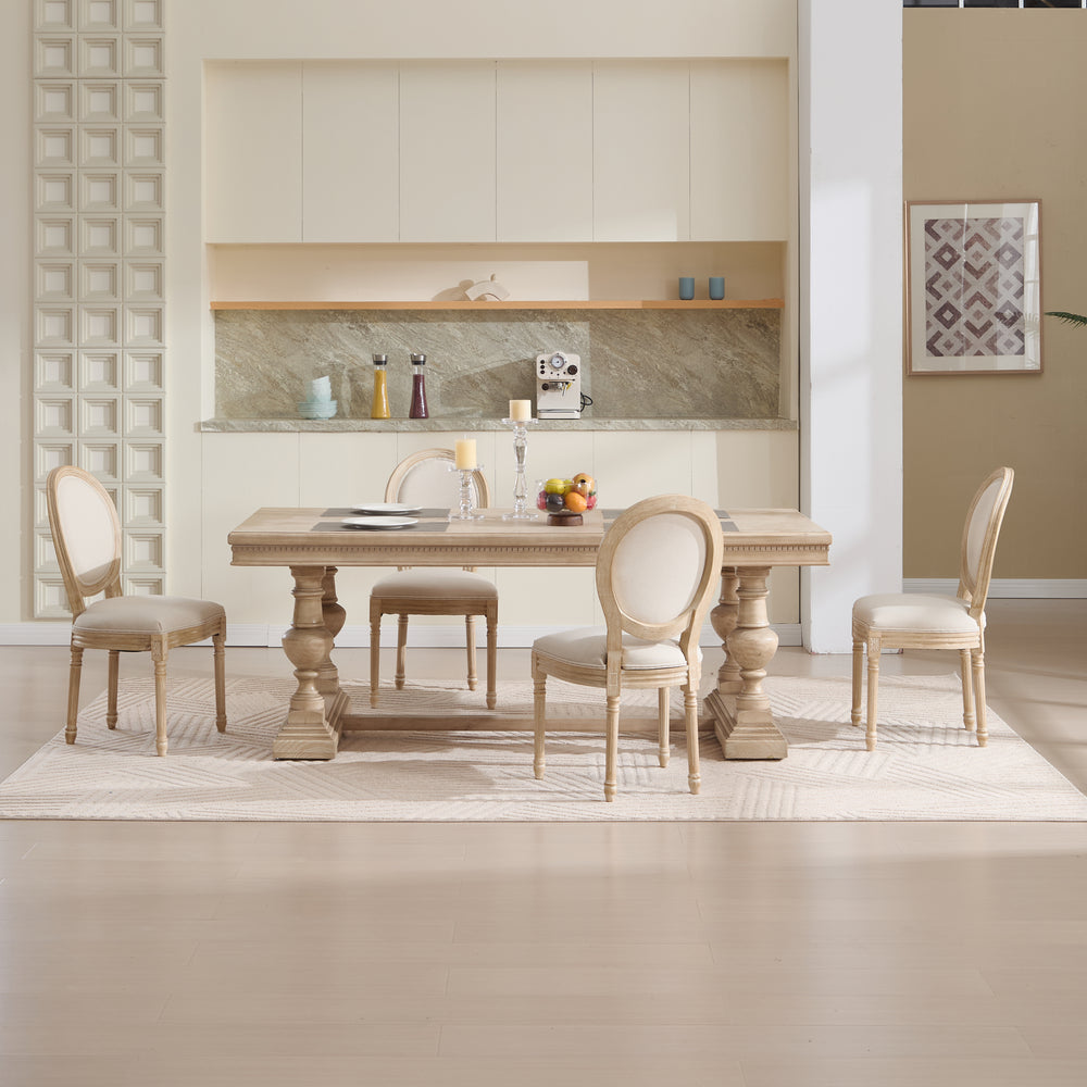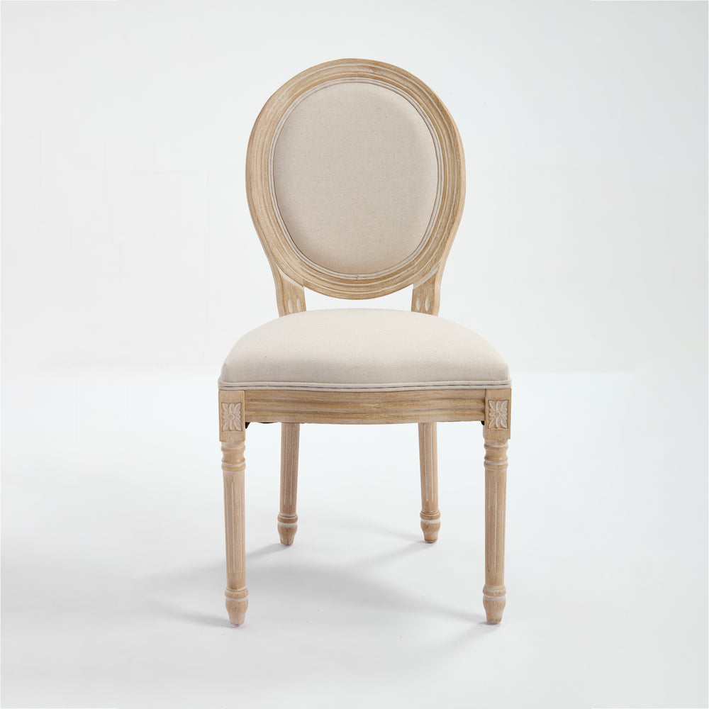 Omega Lifestyles French Country dining chairs feature solid wood frames and soft cotton linen upholstery for durable comfort. Detailed carving and wire drawing techniques offer classic, refined style. Disassemblable design saves space, ideal for living rooms, kitchens, and restaurants.