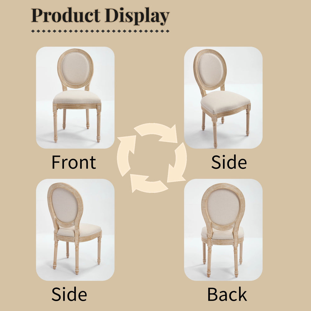 Bring timeless charm and superior comfort to your living room, kitchen, or restaurant with this set of two French Country dining chairs. Featuring a rounded back and high-quality cotton linen upholstery, these chairs offer a soft, breathable seating surface that is both comfortable and durable. The solid wood frame ensures lasting sturdiness, while intricate carving and wire drawing techniques accentuate the classic design with exquisite details and a refined retro texture. Thoughtfully designed with disassemblable construction, these chairs save space and simplify transport or storage. Whether hosting family dinners or stylish gatherings, elevate your decor with chairs that combine classic aesthetics and practical comfort. Easy to assemble with included instructions and tools, these chairs invite you to upgrade your dining space effortlessly. Experience the perfect blend of style and function today.