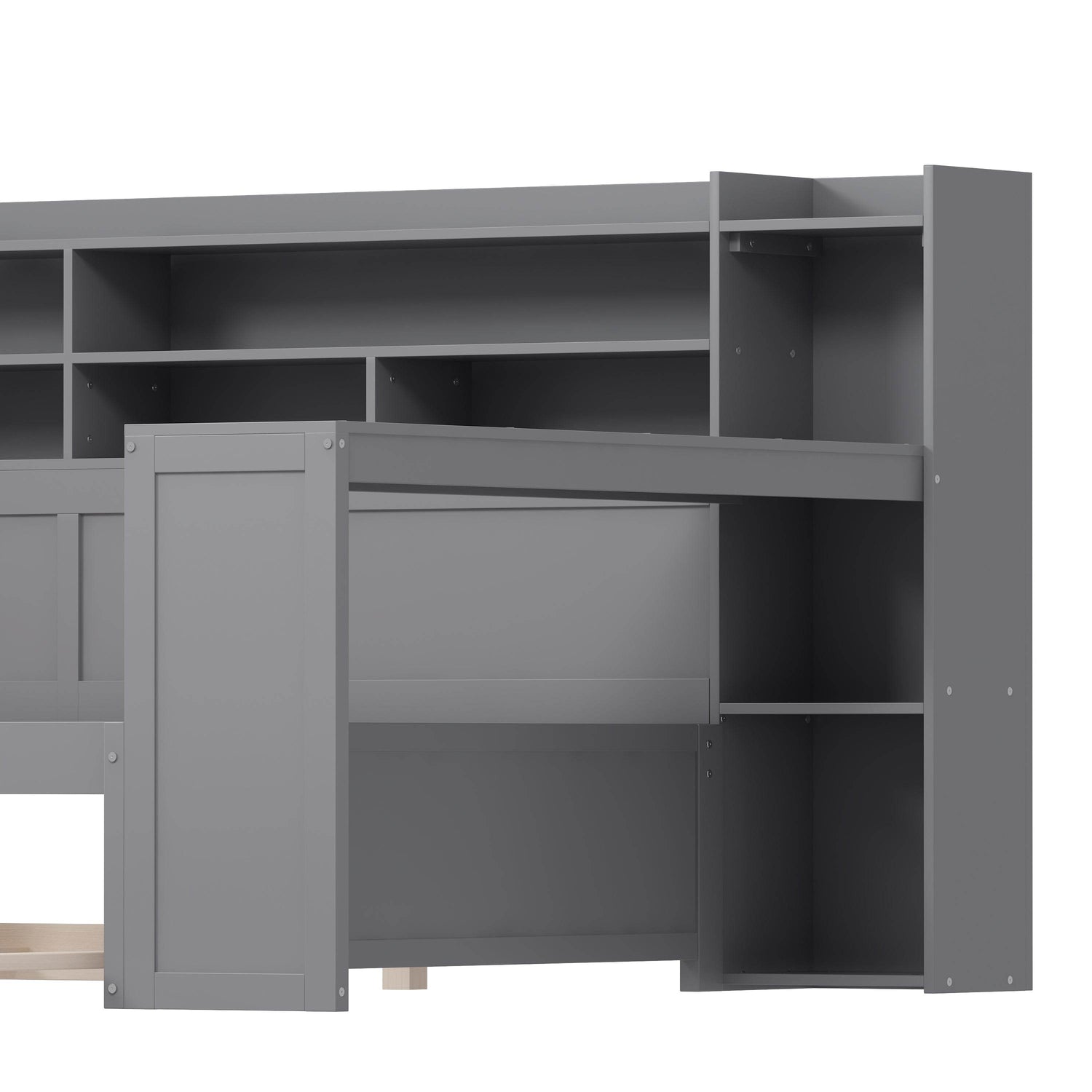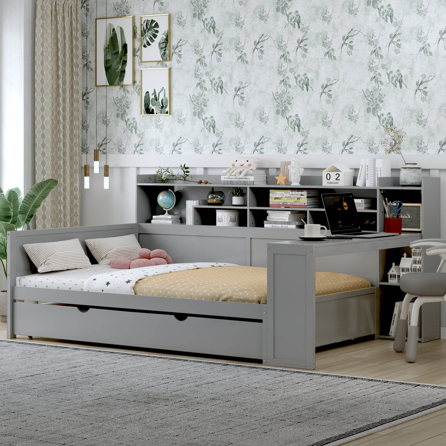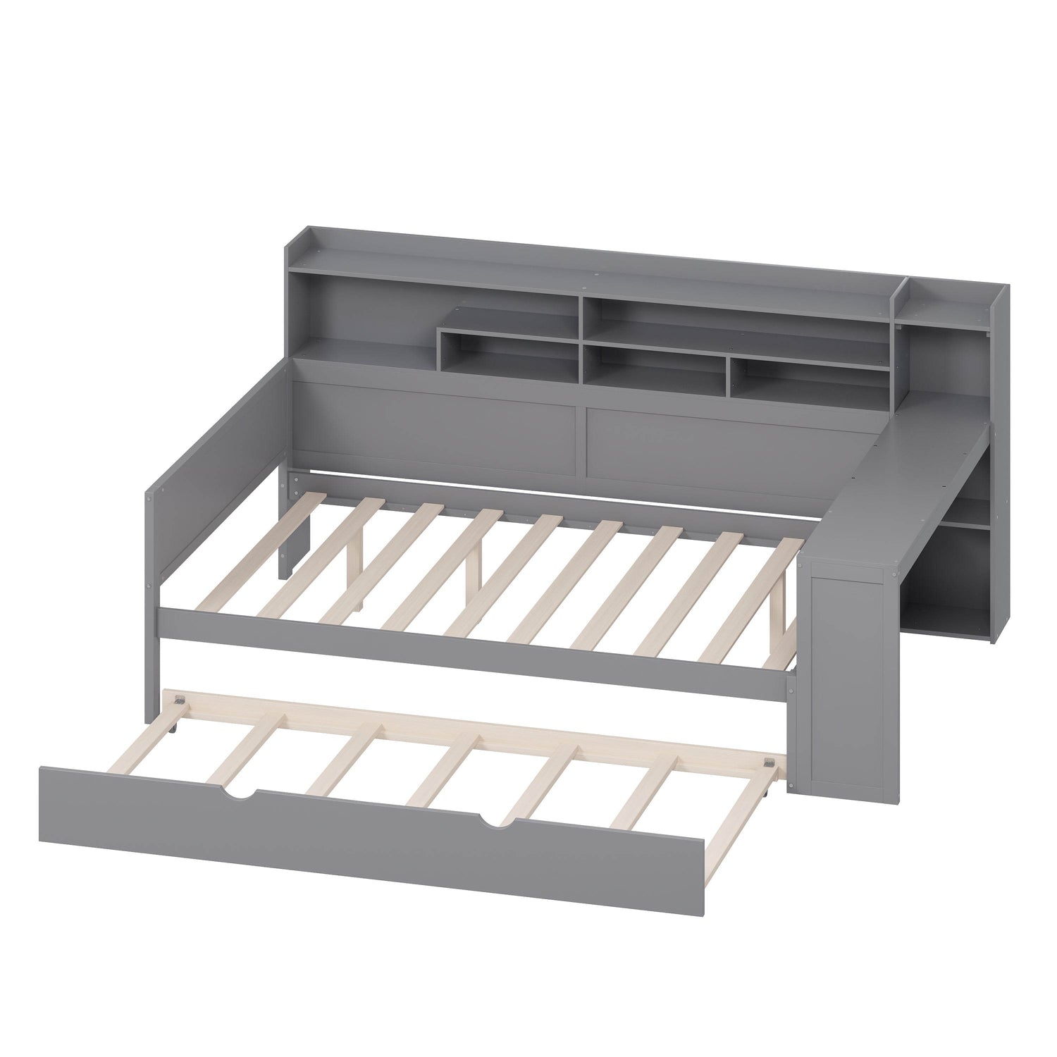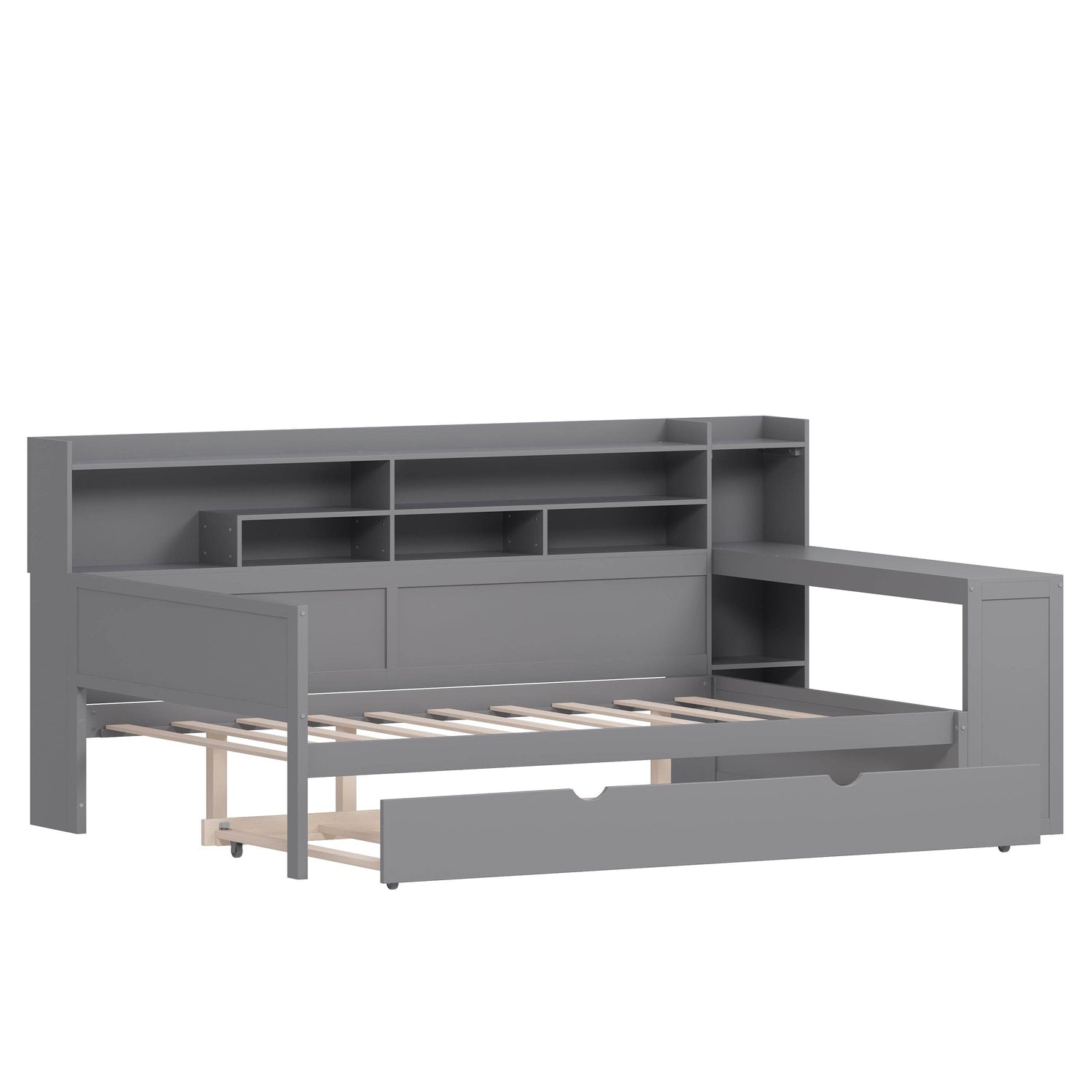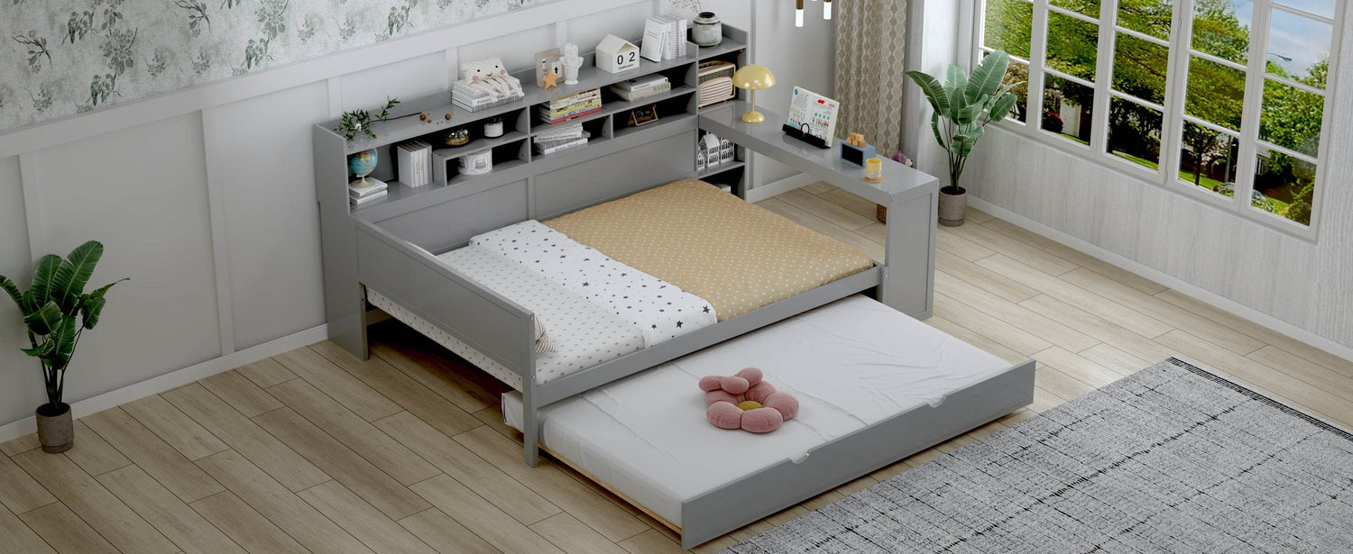 Experience the perfect blend of style, functionality, and space-saving design with this wooden full size daybed in a modern gray finish. Crafted from high-quality MDF, plywood, and pine, this durable bed frame offers long-lasting stability and resists humidity-related damage. It features a built-in twin-size trundle bed, providing an ideal solution for overnight guests without sacrificing floor space. At the foot of the bed, a clever study desk creates a compact yet effective workspace, perfect for studying, working, or reading. Multi-layer storage shelves built into the side offer ample room to organize books, decor, and essentials, keeping your bedroom tidy and efficient. Designed to fit full-size mattresses up to 6 inches thick, this versatile daybed transforms any room into a multifunctional living and working area. Elevate your bedroom with this innovative and space-smart bed today.