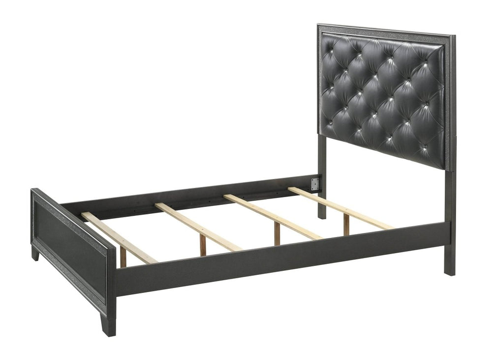 Contemporary King size panel bed features a plush, tufted headboard with shimmering dark gray upholstery and a sturdy wood frame. Ideal for bedroom use, it offers stylish comfort and requires a box spring for support, with simple assembly needed.