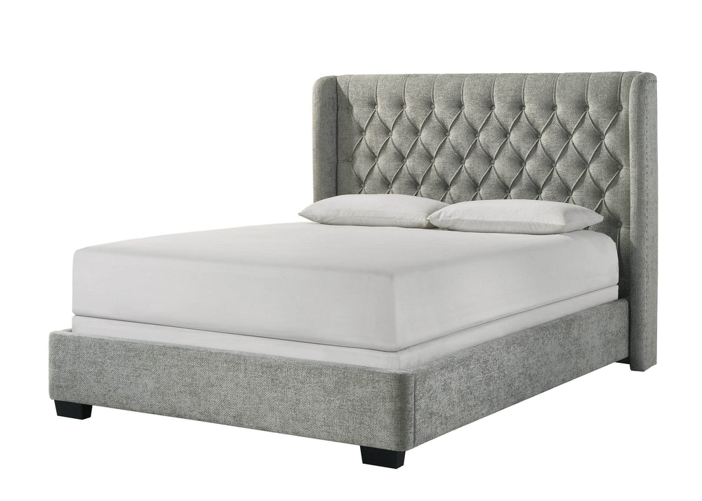 Elevate your bedroom with this stylish king-size bed frame featuring a soft gray tweed fabric and a plush, button-tufted winged headboard. Crafted from durable wood, this contemporary panel bed combines comfort with lasting quality, making it the perfect centerpiece for a modern bedroom. The upholstered headboard offers cozy support for reading or relaxing, while the sleek gray finish complements a wide range of decor styles. Designed to accommodate a box spring, this frame provides sturdy, reliable support for your mattress (not included). Measuring approximately 90 inches long by 85 inches wide and standing 55 inches tall, it offers ample space and presence. Refresh your sleeping space with this sophisticated frame that balances elegance and functionality. Elevate your relaxation today.