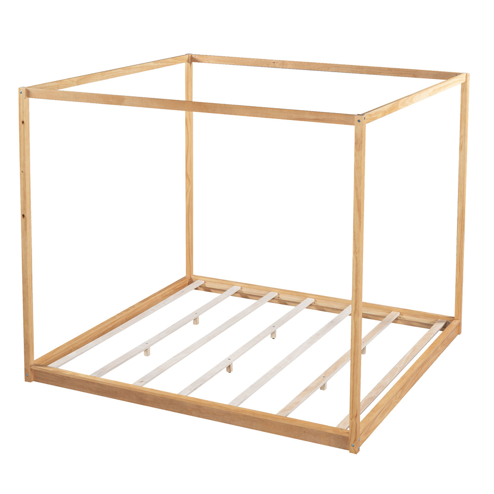 Create a stunning centerpiece in your bedroom with this king size canopy platform bed, crafted from sturdy pine wood and durable MDF. Its clean, modern silhouette complements any décor while the canopy frame invites you to personalize with curtains or fabric for a custom look. The slat base promotes airflow beneath your mattress, keeping your sleeping area fresh and preventing moisture buildup so your mattress stays cleaner and lasts longer. Designed to support up to 700 lbs with additional support legs, this bed requires no box spring, making it an easy, stylish upgrade. Assembly is straightforward with all tools and instructions included, allowing you to refresh your bedroom in under an hour. Experience lasting quality and cozy comfort—add this natural wood canopy bed to your home today.