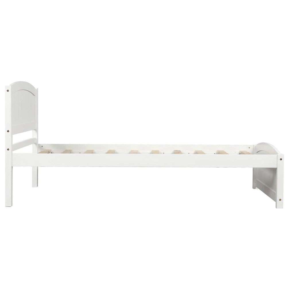 Elevate your bedroom with this minimalist wood platform bed, featuring a crisp white finish and a sturdy pine wood frame. Designed to blend seamlessly with any decor style, this bed offers both elegance and function. The included headboard and footboard provide classic appeal while securing your pillows and bedding throughout the night. Ten solid wood slats support your mattress evenly, enhancing durability and comfort without the need for a box spring. Lightweight yet strong materials make it easy to relocate, while its clean lines create an open, airy feel in your space. With dimensions of 79.5 inches long, 41.7 inches wide, and 35.4 inches high, this bed frame fits most standard mattresses perfectly. Bring home timeless style and lasting stability to transform your sleep environment today.
