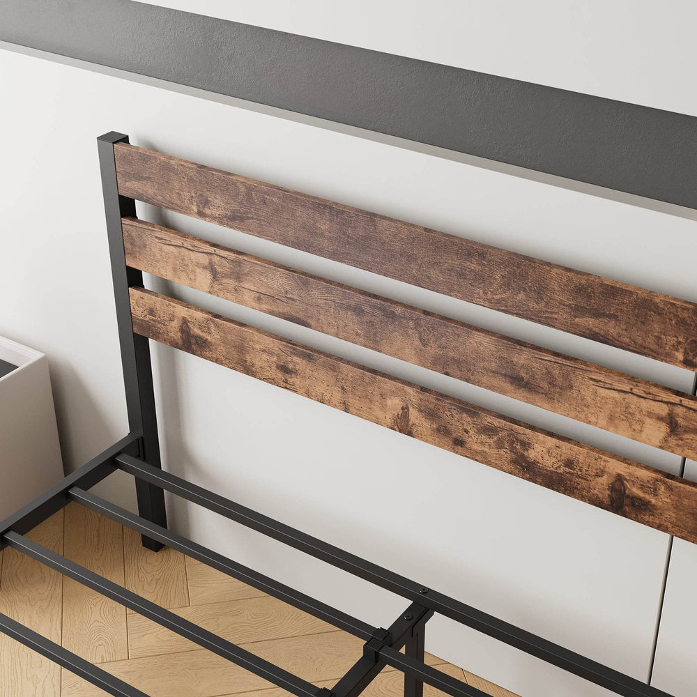 Upgrade your bedroom with this queen size platform bed frame featuring a rustic vintage wood headboard and footboard that adds timeless character to any space. Designed with strong metal slats, this bed frame provides solid mattress support without the need for a box spring, ensuring a comfortable and stable foundation for your 6 to 12-inch mattress. The durable combination of metal and wood offers lasting strength while complementing your decor with a warm brown wood tone and sleek black frame. Enjoy the added convenience of 10.6 inches of under-bed storage, perfect for organizing bedding, boxes, or seasonal items. Noise-free foam padding inside the frame eliminates squeaks for uninterrupted rest. Easy to assemble with all tools and instructions included, this platform bed is the perfect blend of industrial retro style and practical design to elevate your bedroom setup. Elevate your sleep space today.
