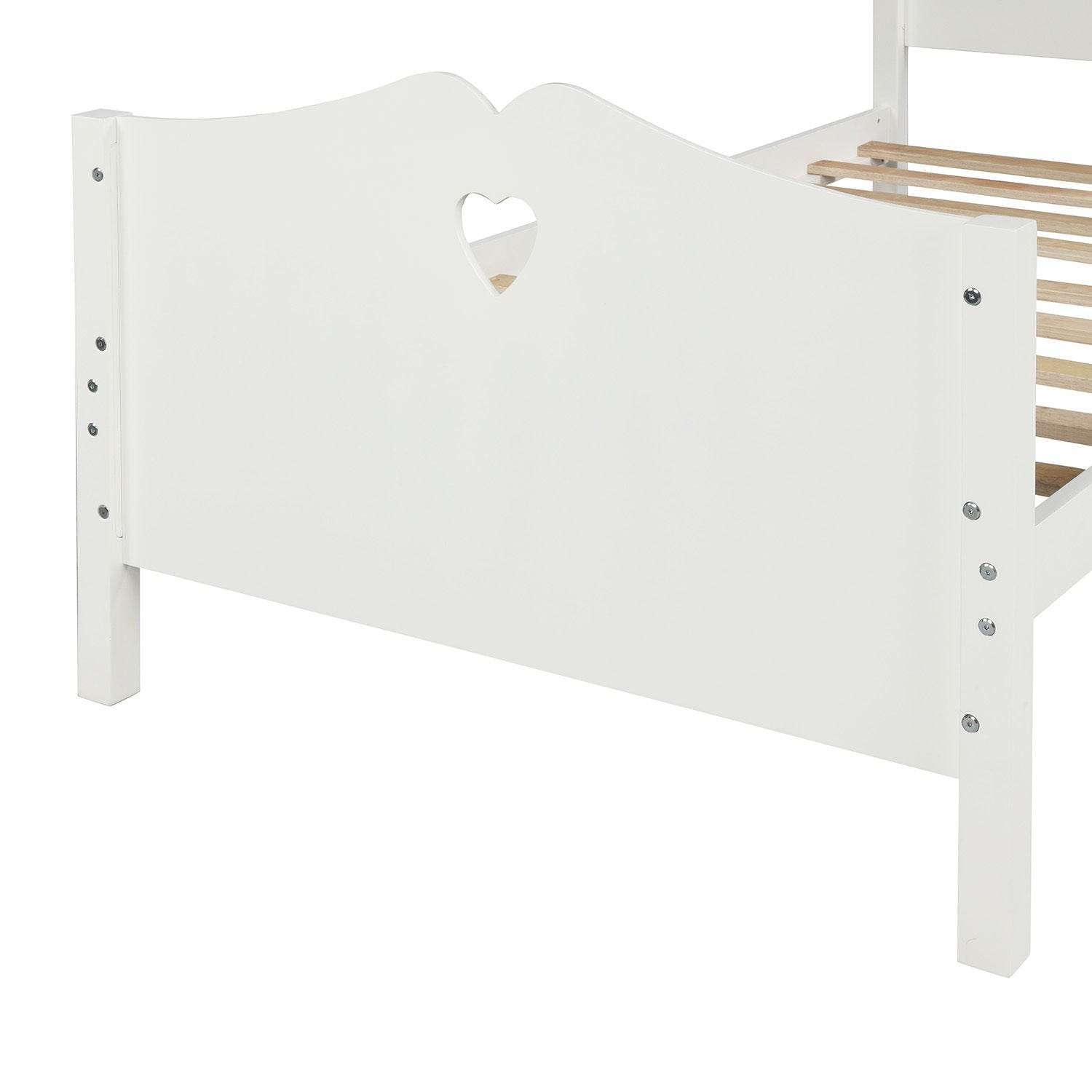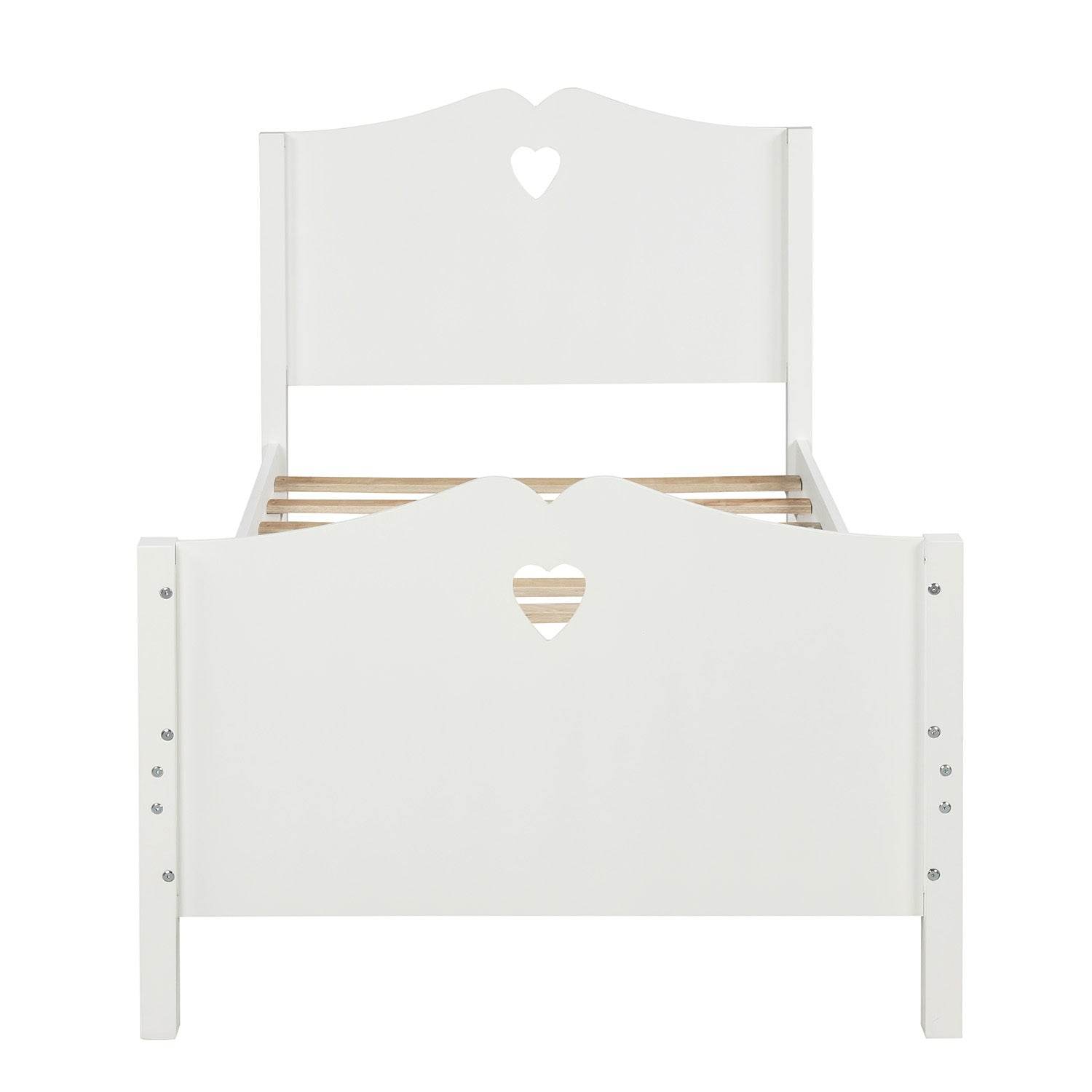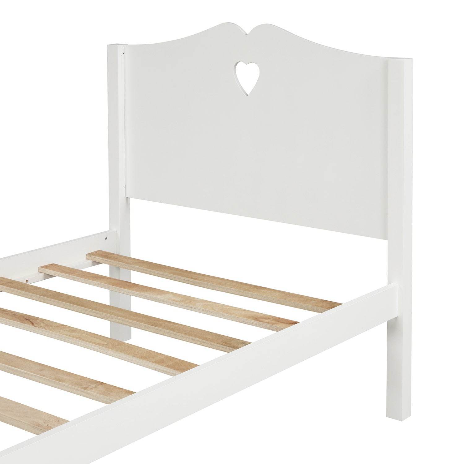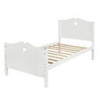 Minimalistic twin platform bed features solid pine wood with ten slats for sturdy support, a headboard, and footboard in a clean white design that complements various decor styles. Lightweight yet durable, it requires simple assembly and supports mattresses up to 8 inches thick.