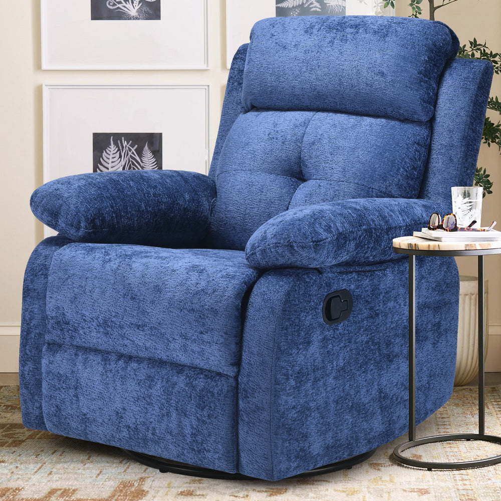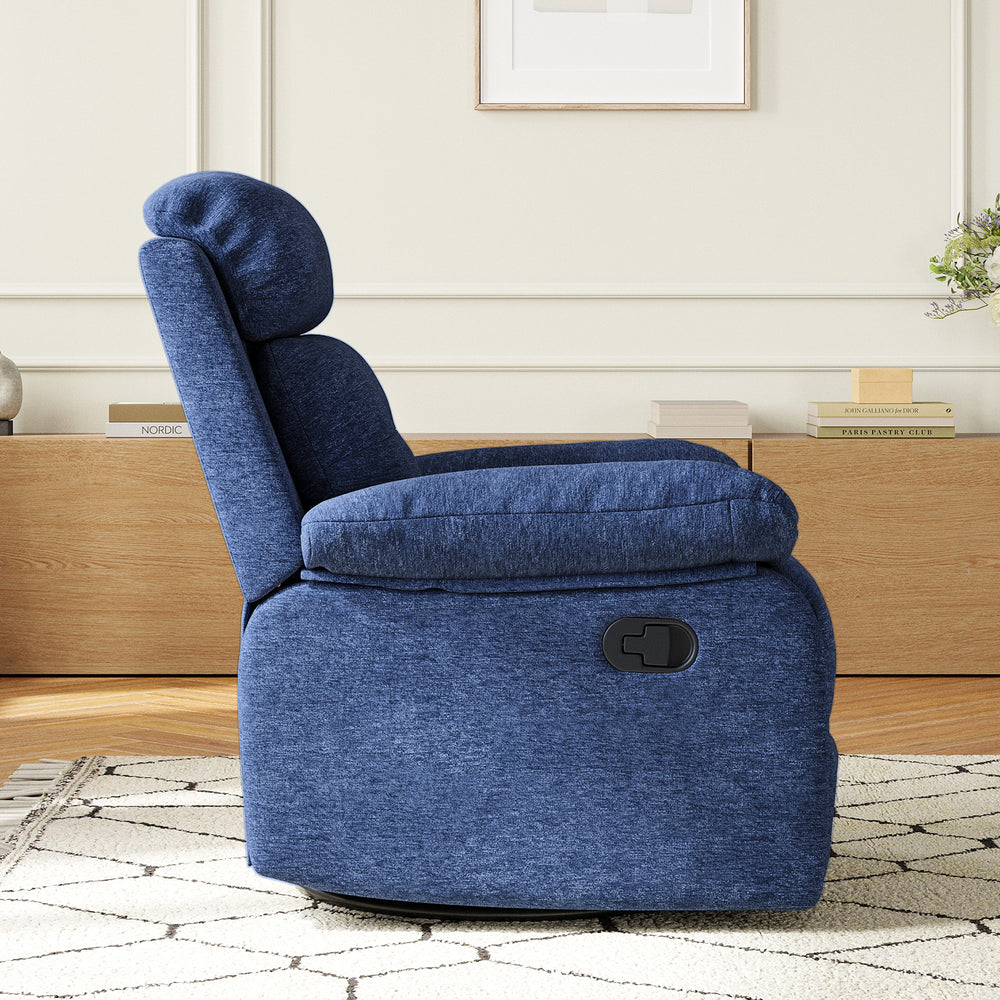 Perfectly designed for small spaces, this stylish rocker swivel recliner chair offers a versatile seating solution for bedrooms, living rooms, or compact apartments. Tailored especially for smaller adults 5'4" and under, its snug dimensions provide a comfortable seat without overwhelming your room. Crafted with a sturdy metal frame and upholstered in a calming blue fabric, this chair supports up to 330 pounds while delivering smooth 360° swivel and gentle 30° rocking motion. The adjustable reclining back allows you to find your ideal position from 90° to 150°, whether you’re reading, watching TV, or relaxing. Easy to assemble in just five minutes, it arrives in one box for a hassle-free setup. Elevate your relaxation space today with this small recliner that combines function, comfort, and style.