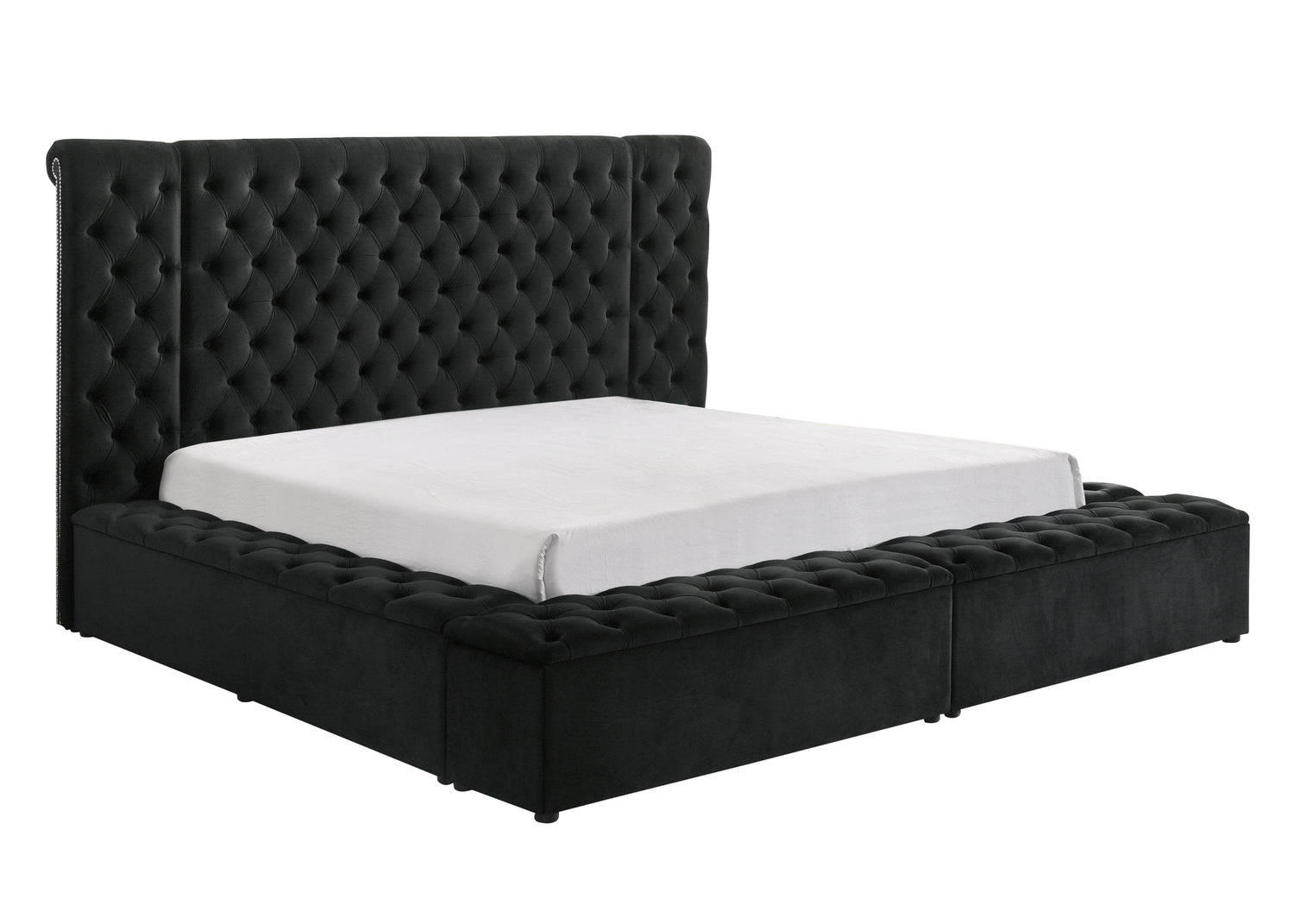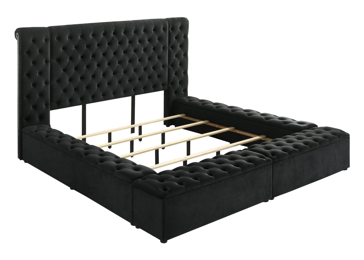 Elevate your bedroom with this stunning queen bed frame, featuring plush black velvet upholstery and a sophisticated button-tufted headboard for a timeless traditional look. Crafted with a durable wood frame, this bed offers both style and stability to support restful nights. Cleverly designed with multiple concealed storage compartments, including footboard storage, it helps you maintain a neat, clutter-free bedroom without sacrificing elegance. Measuring 104 inches long, 85.5 inches wide, and 61 inches high, this majestic bed creates a beautiful focal point that transforms your space into a modern sanctuary. Perfect for pairing with any mattress, it invites both relaxation and refined style. Elevate your bedroom comfort and organization today.
