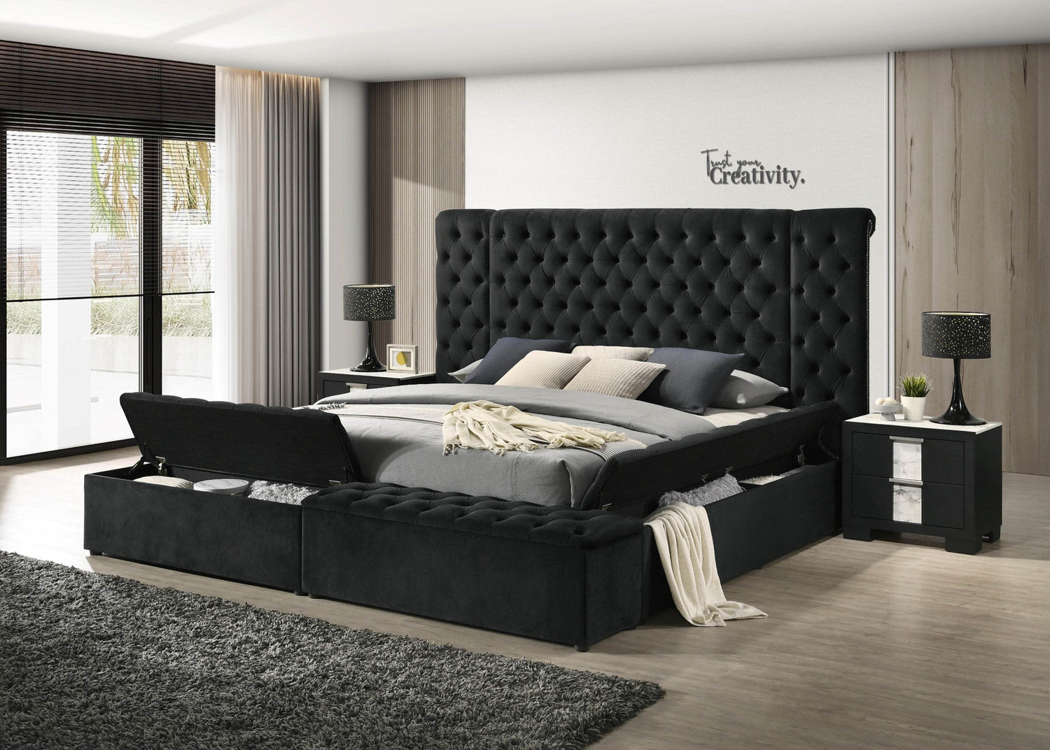 This black velvet queen bed frame features a plush button-tufted headboard and multiple concealed storage compartments, combining traditional style with practical organization. Crafted with wooden frame and luxurious upholstery, it enhances bedroom comfort while maintaining a clutter-free space.