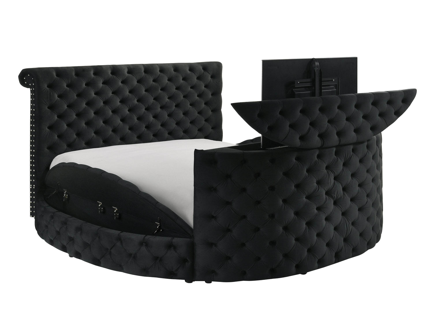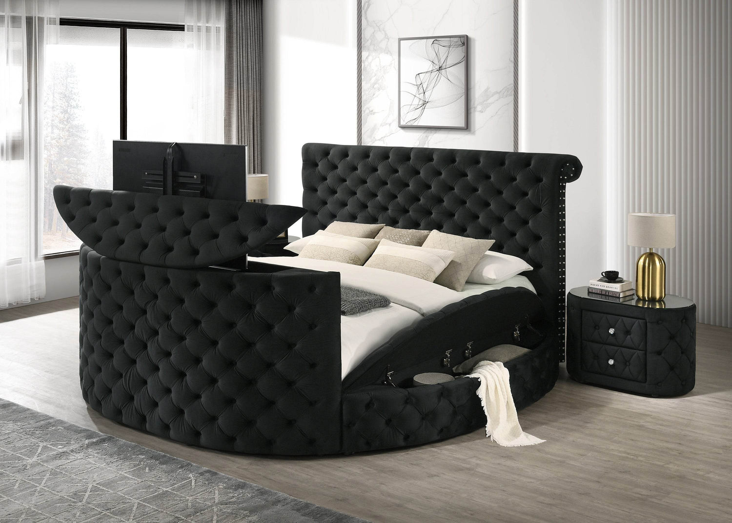 Elevate your bedroom with this ultra-modern king size bed featuring a deeply tufted headboard accentuated by elegant nail head trim. Upholstered in sumptuous black velvet, it offers both style and tactile comfort that transforms your sleep space into a sophisticated retreat. The footboard hides an integrated television lift mechanism compatible with 32" to 50" TVs, blending entertainment seamlessly into your bedroom design. A built-in electric fireplace adds a cozy warmth and inviting ambiance, perfect for relaxing evenings. Crafted with a solid wood frame and practical built-in storage, this bed balances luxury with functionality. With a substantial size of 104.6 inches long by 93.8 inches wide and 56.3 inches tall, it serves as a statement centerpiece for your bedroom. Box spring required; mattress sold separately. Simple assembly lets you enjoy your stylish new bed in no time. Enhance your bedroom lifestyle today.