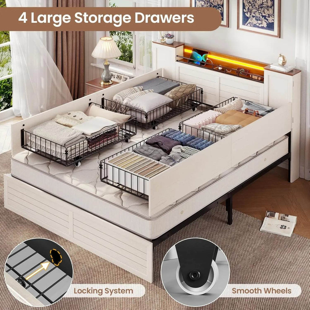 【4 Large Storage Drawers】Maximize every inch of your bedroom with 4 large-capacity under-bed drawers designed for effortless organization! Each deep, sliding drawer glides smoothly on 4 wheels, offering access to store bulky items. Ideal for tight spaces, dorm rooms, or family homes, these drawers keep clutter hidden yet within reach. No handle design maintains the bed\u2019s charm while blending seamlessly into any décor.