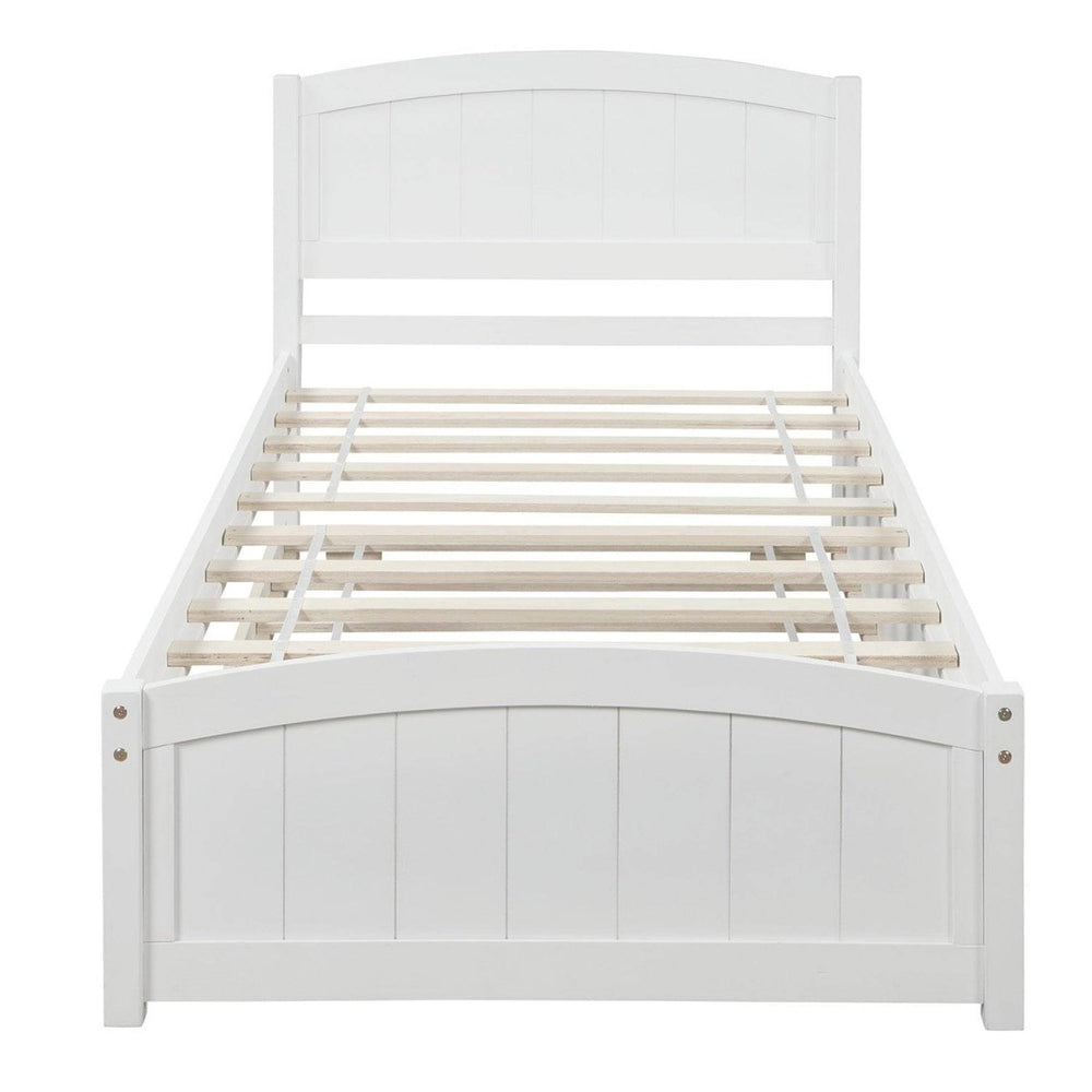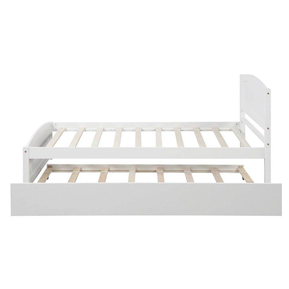 Experience the perfect blend of style and functionality with this twin platform bed featuring a convenient roll-out trundle. Crafted from solid pine wood and reinforced with sturdy slats, this bed frame offers exceptional durability and support without the need for a box spring. The clean, minimalist design in a crisp white finish complements any bedroom décor, creating a fresh, inviting atmosphere. Ideal for small rooms or guest spaces, the trundle efficiently expands your sleeping options, easily accommodating overnight guests. With a weight capacity of 300 lbs for both the platform and trundle bed, it ensures strong, reliable support. Thoughtful ventilation design keeps your mattress fresh, while included clear assembly instructions make setup straightforward. Elevate your sleeping space with this stylish and space-saving bed frame today.