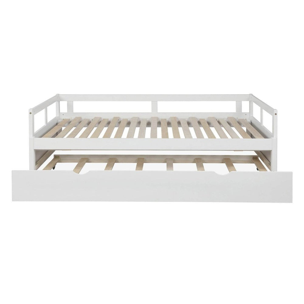 Perfect for homes that value both style and functionality, this extending daybed with pull-out trundle offers versatile sleeping arrangements without sacrificing space. Crafted from high-quality solid pine wood with a durable frame and legs, it ensures lasting stability and support. The twin-sized daybed easily transforms into a king-sized sleeping area when the trundle is extended, providing flexible accommodations for guests or family members. Designed with 19 slats on the upper bed and 8 on the trundle, it supports your mattress without the need for a box spring while promoting airflow to keep your mattress fresh. Featuring smooth casters, the trundle glides out effortlessly, making setup quick and hassle-free. Its clean silhouette and neutral white finish complement any bedroom décor, completing your space with understated elegance. Assembly is required, but clear instructions and tools are included. Elevate your home’s sleeping versatility today.