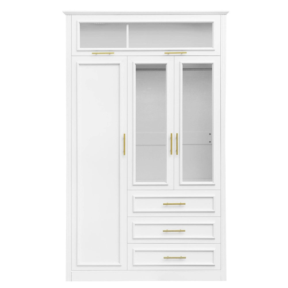 Maximize your storage space and keep your clothing collection beautifully organized with this modern 3 Door Wardrobe Armoire Closet. Crafted from solid wood and MDF, the clean white finish with gold accents adds timeless elegance to any room. Integrated LED illumination makes it easy to find your clothes and accessories, even in low light. The versatile design includes three spacious drawers, multiple hanging spaces in different sizes, and a storage cabinet with both wooden and glass doors—perfect for displaying or concealing your wardrobe essentials. Its thoughtful layout accommodates both thin and thick garments, helping you maintain a clutter-free space. Assembly is straightforward with detailed instructions and all necessary tools included. Refresh your bedroom today with this stylish and functional storage solution.