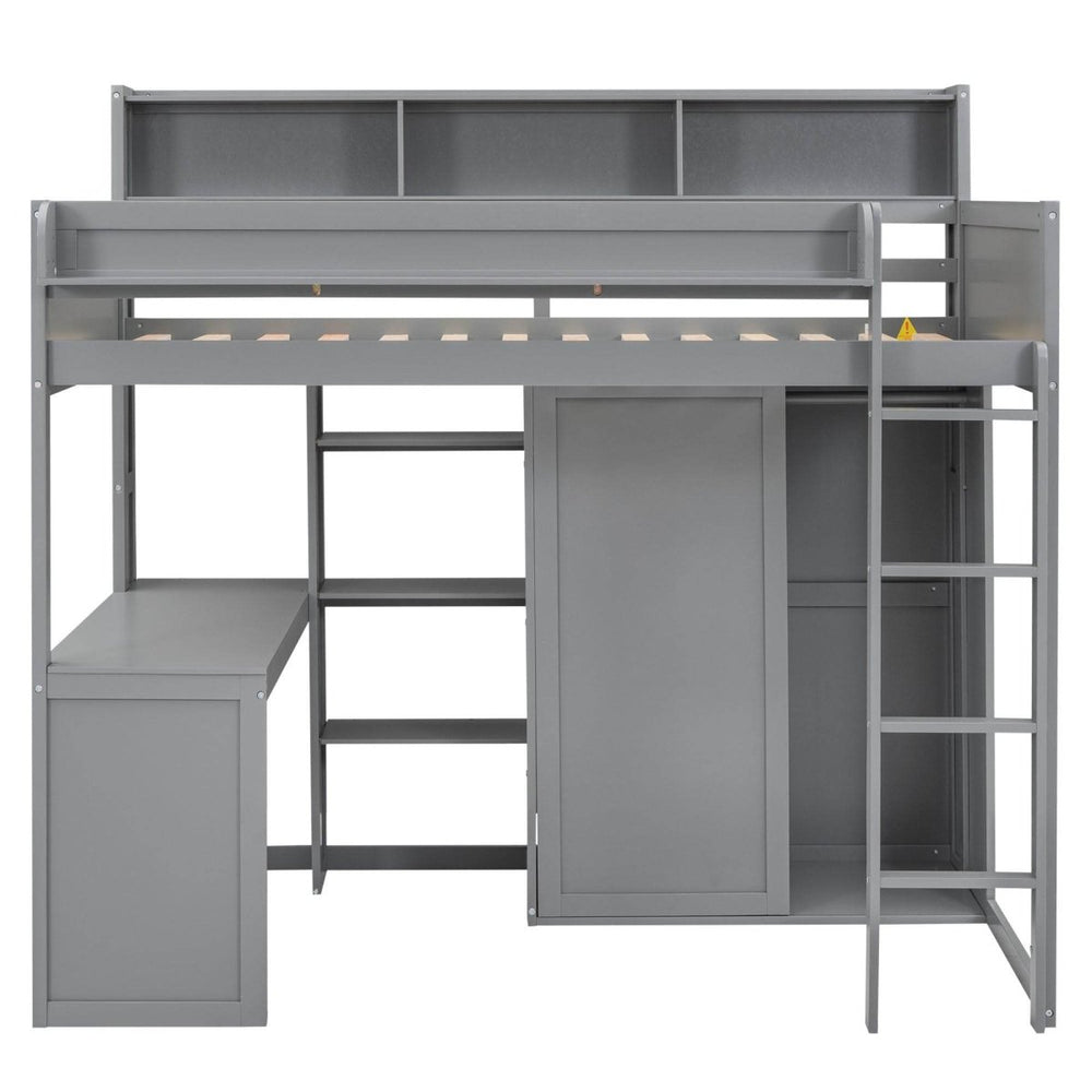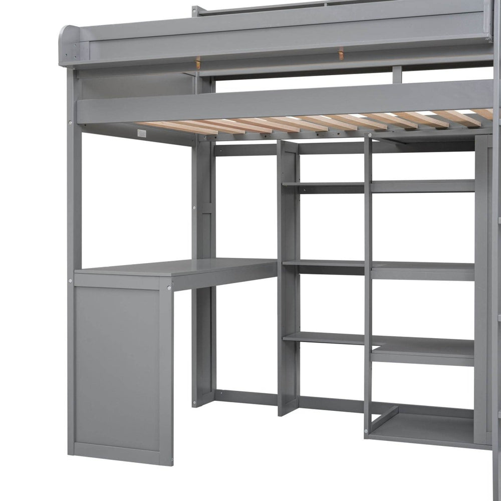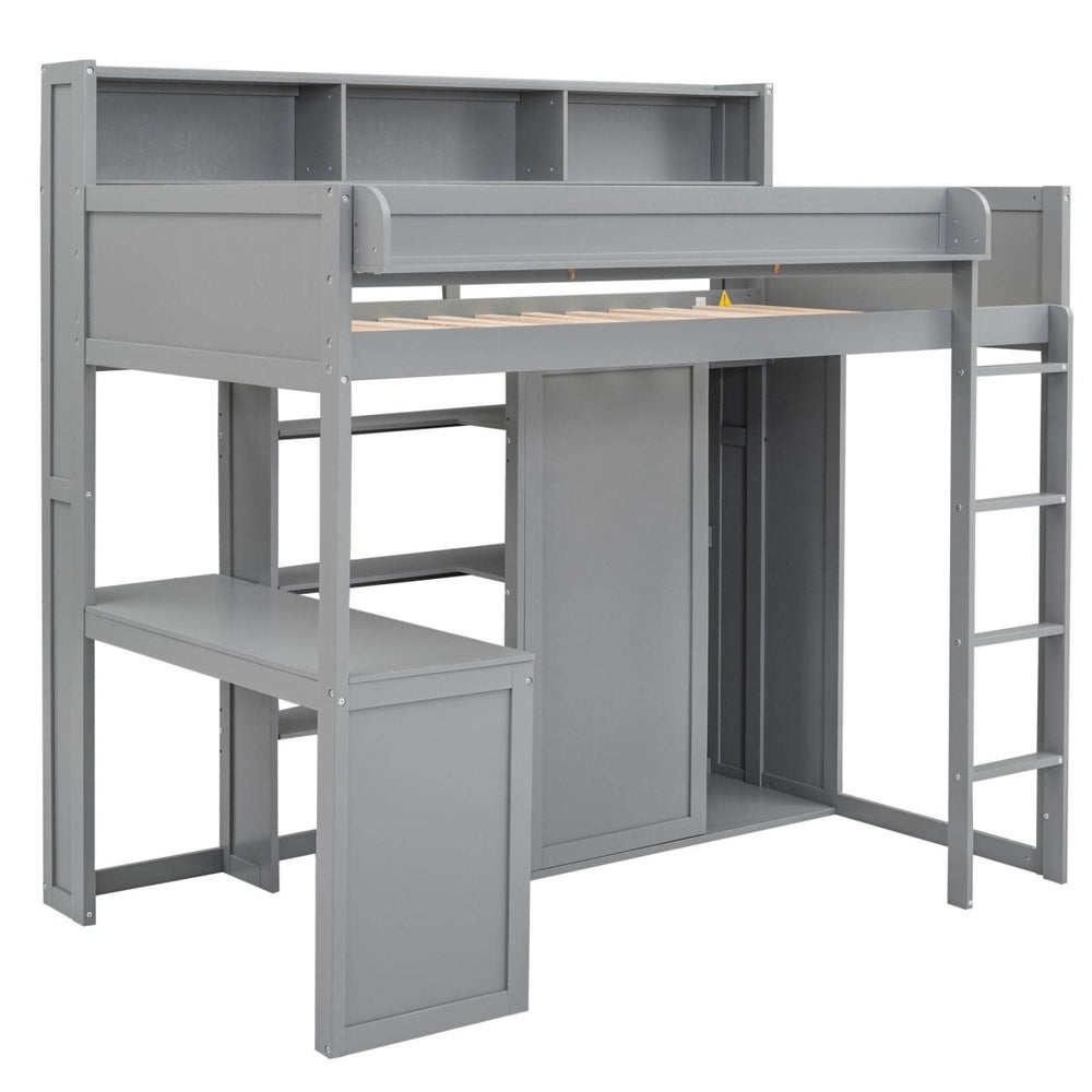 Experience ultimate space-saving design with the Wood Loft Bed featuring multiple storage shelves and an integrated wardrobe in a sleek gray finish.